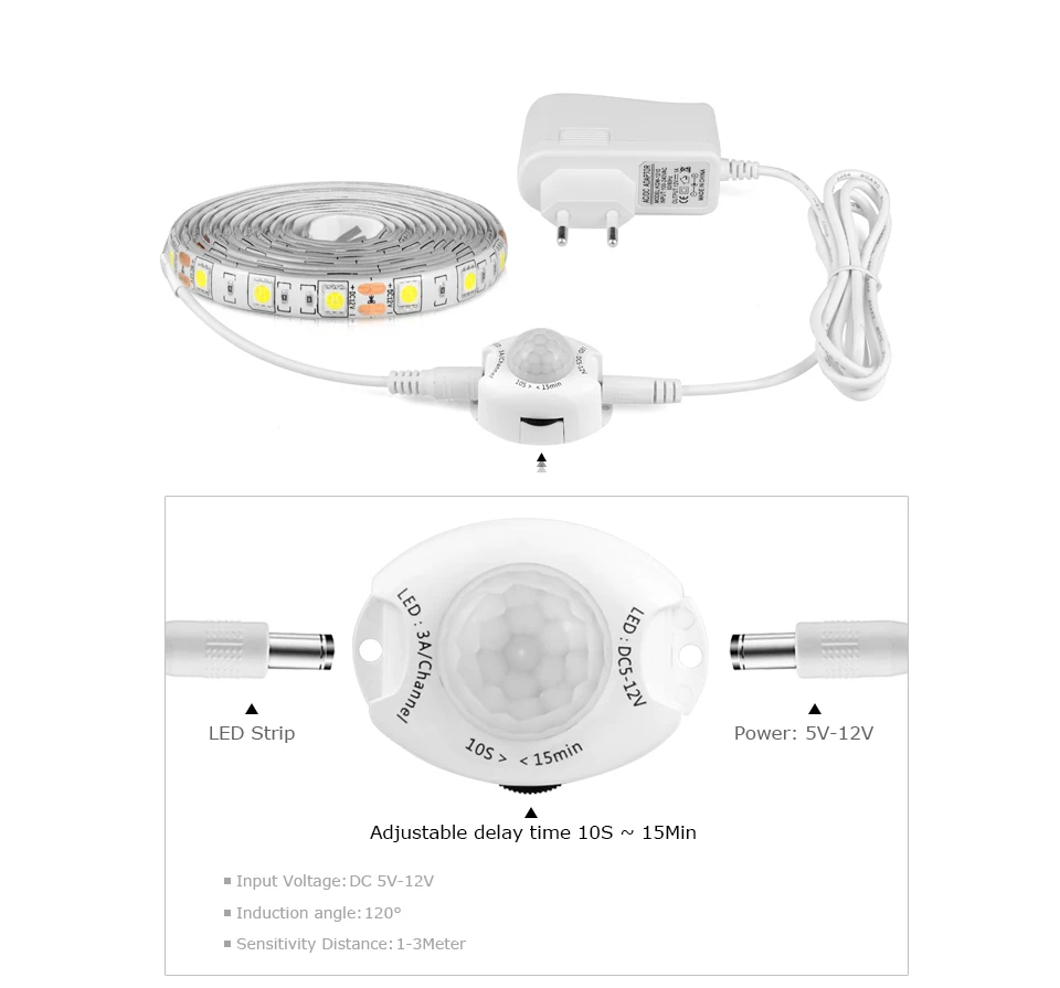 Тип: Светодиодная лента 12 в 5050 с датчиком движения и адаптером питания 2 А Тип СВЕТОДИОДА: 5050SMD Цвет светильник: белый/теплый белый Цветовая температура: белый (6000k-6500K); Теплый белый (2700K-3500K) Расстояние чувствительности: 1 м-3 м Временная задержка: 10 сек-15 мин (регулируется) Длина светодиодной ленты: 1 м/2 м/3 м/4 м/5 м Кол-во светодиодов: 60 светодиодов/м Класс водонепроницаемости: IP65
