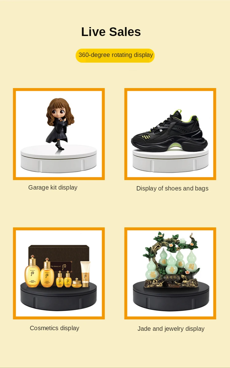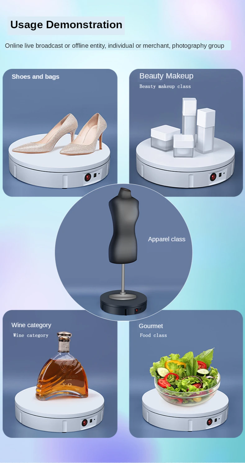 Спецификация: Вращающаяся подставка для ювелирных изделий/вращающийся стол для съемки персонажей Высокая грузоподъемность, максимальная нагрузка 50 кг/100 кг Широко используется для демонстрации ювелирных изделий, часов, моделей в реальном времени, цифровых камер и других товаров. С дистанционным управлением, просто и удобно. Тип: поворотный стол дисплея Источник питания: перезаряжаемый постоянный ток Материал корпуса: АБС-пластик + акрил Нормальная Скорость: регулируемая скорость Размер: 20 см x 6 см/8,66 "x 2,3"; 30 см x 6 см/11,81 "x 2,3" (приблизительно) Грузоподъемность: 110-220 фунтов. Посылка входит: 1 вращающаяся подставка для дисплея, 1 адаптер питания переменного тока, 1 руководство по эксплуатации Одна посылка: пузырчатая, картонная Детали: Идеально подходит для демонстрации ценных продуктов, таких как ноутбуки, автомобили, мобильные телефоны, манекены, анимационные модели, игрушки Gundam, модели автомобилей, часы, кристаллы и т. д., используется в магазинах, витринах и запчастях. Примечания: Из-за разницы в освещении и настройках экрана цвет этого элемента может немного отличаться от изображения. Из-за различных методов измерения вручную возможны незначительные различия в размерах. Посылка входит: 1 поворотный стол; 1 руководство