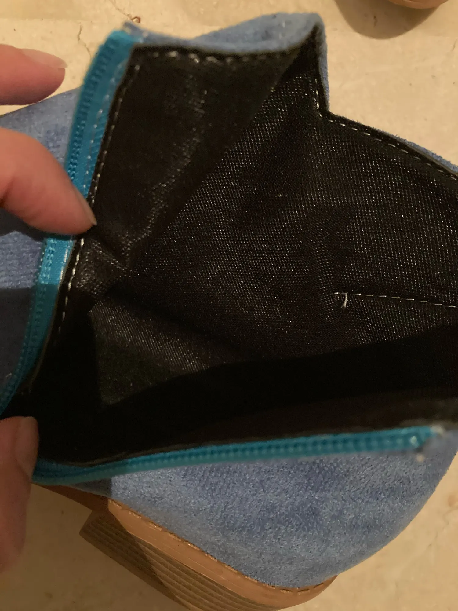 Плохое качество отделки. Вы можете увидеть резинку на подошве. Цвет также легче, чем на картинке.