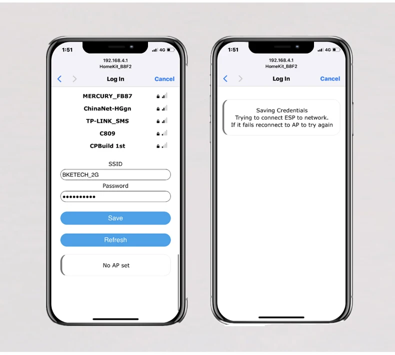 Включите устройство и используйте компьютер или телефон, найдите Wi-Fi, пока не найдите Homekit_xxxxx и нажмите для подключения. Подождите несколько секунд, пока не появится страница настройки.После того, как вы подключите его, веб-конфигурация автоматически всплывет (если нет, пожалуйста, используйте ваш веб-браузер, посетите IP-адрес: 192.168.4.1, затем выберите Wi-Fi роутер, который вы хотите подключить (убедитесь, что подключен к 2,4G, а не к 5,8G)