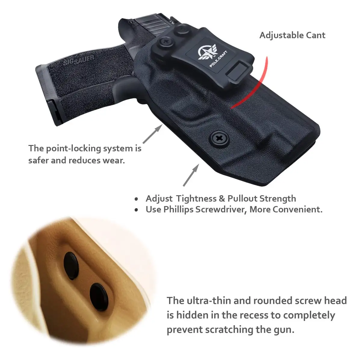 Наша кобура Sig Sauer P365xl Kydex IWB имеет звуковую систему блокировки Posi-Click, и пистолет имеет четкий звук «щелчок», когда он вставлен, так что вы знаете, что ваш пистолет плотно сидит. Поскольку время реакции имеет критическое значение для выживания, мы используем установочный винт для регулировки герметичности для определения силы, необходимой для извлечения. Нейлон + ремень из стекловолокна крепкие и надежные зажимы, вы можете отрегулировать угол от 0 до 15 градусов в соответствии с вашими привычками, чтобы вы могли достичь самой быстрой скорости.