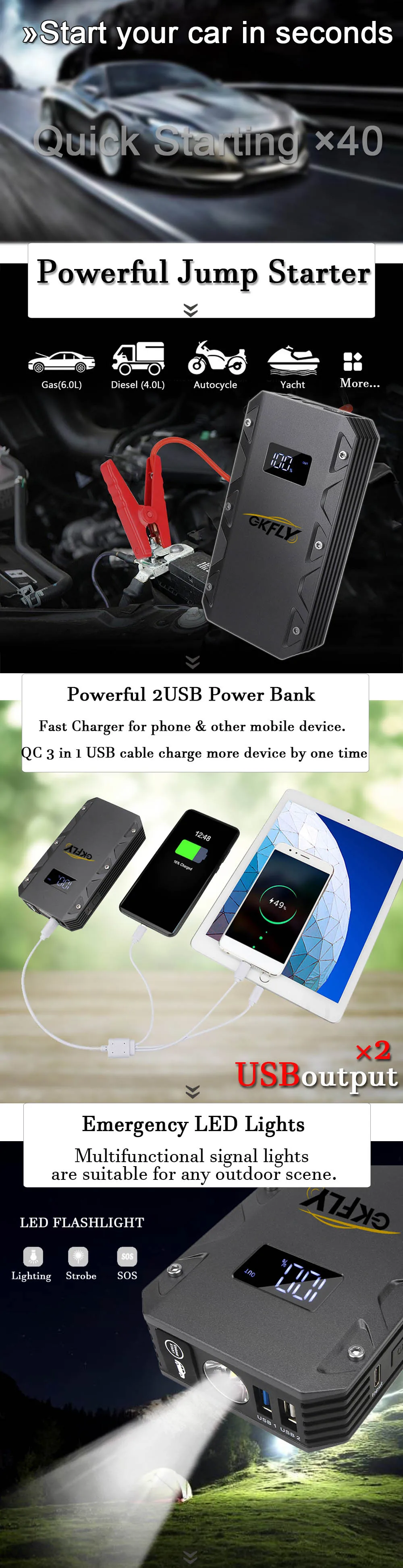 GKFLY пусковое устройство для автомобиля, стартер для аварийного заряда, стартовый Аккумулятор для прыжков, портативный внешний аккумулятор, пусковое устройство, 12 В, автомобильное зарядное устройство