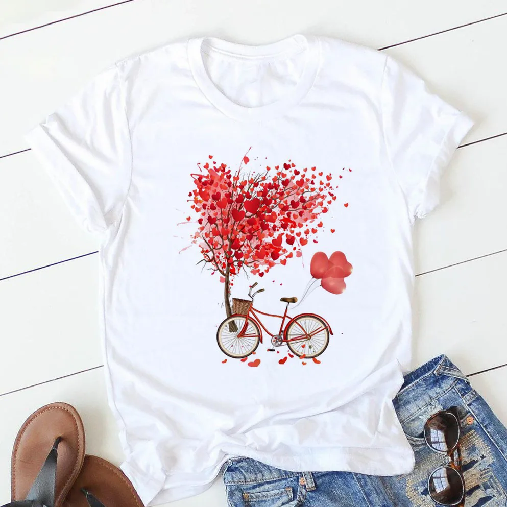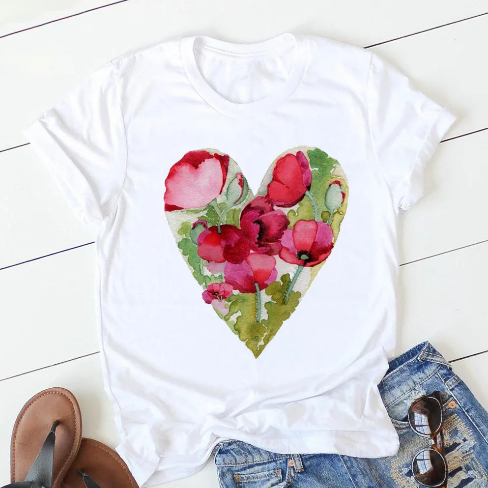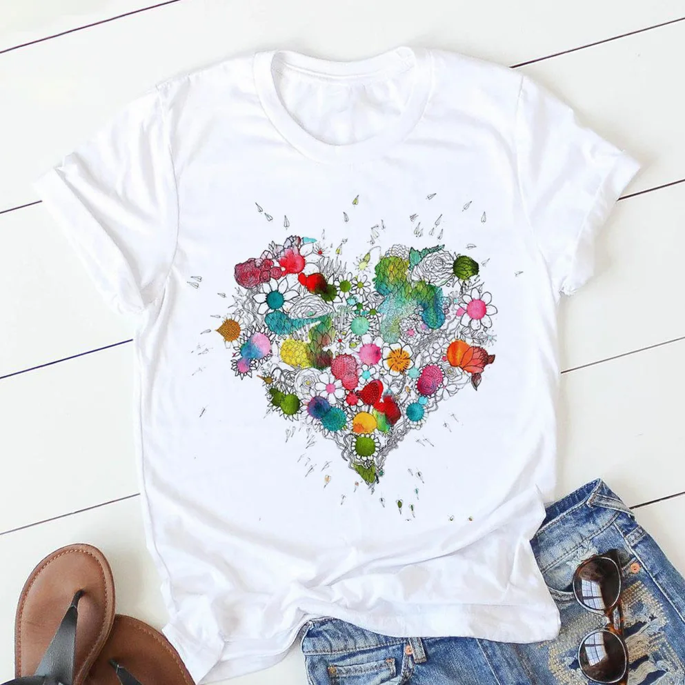 Женские футболки с принтом сердца, корейские модные летние топы с рисунком, женская одежда с круглым вырезом, футболки для девочек