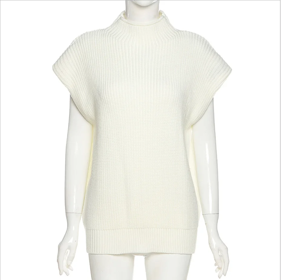 Женский свитер-водолазка без рукавов, однотонный вязаный пуловер с подплечниками, белый Повседневный джемпер, весна Свободный жилет, 2021