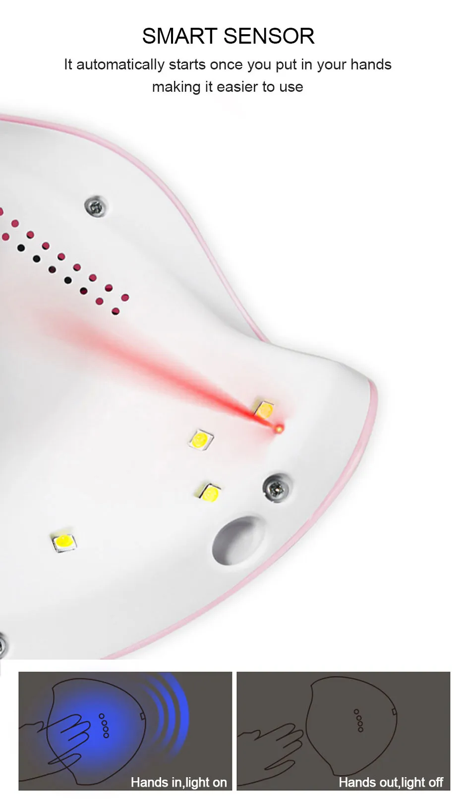 1. Может использоваться для лечения различных гелей для ногтей, таких как УФ-лак и базовые гели. (Не может использоваться для сушки лака для ногтей.)2. Режим низкого нагрева и защита кожи ваших рук.
