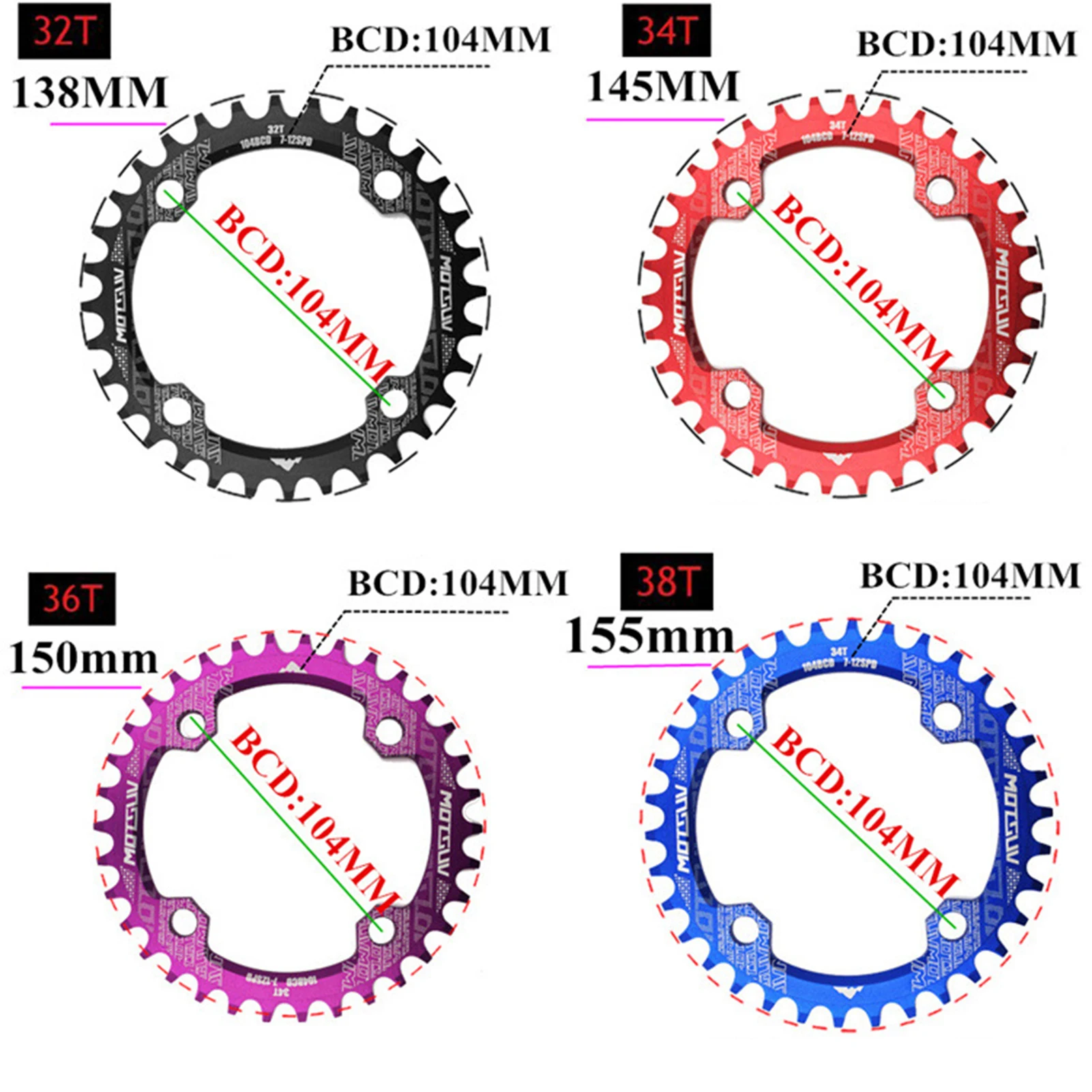 104BCD велосипедный Кривошип, круглая форма, узкая, широкая цепь для горного велосипеда, велосипедная цепь, велосипедный круглая Кривошип, одна пластина 32T34T36T38T