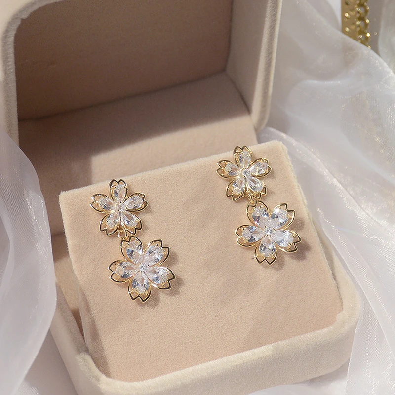 Серьги-гвоздики женские из настоящего золота 14 карат, с двойными цветами