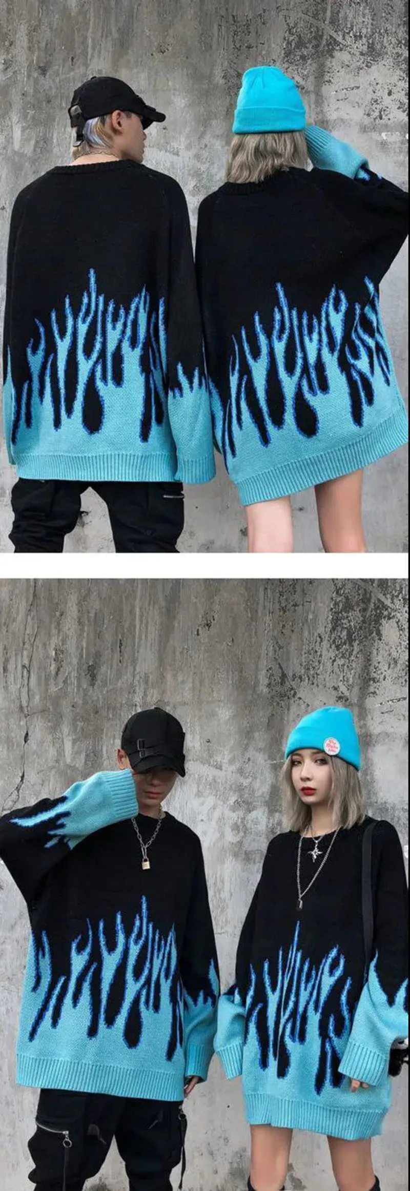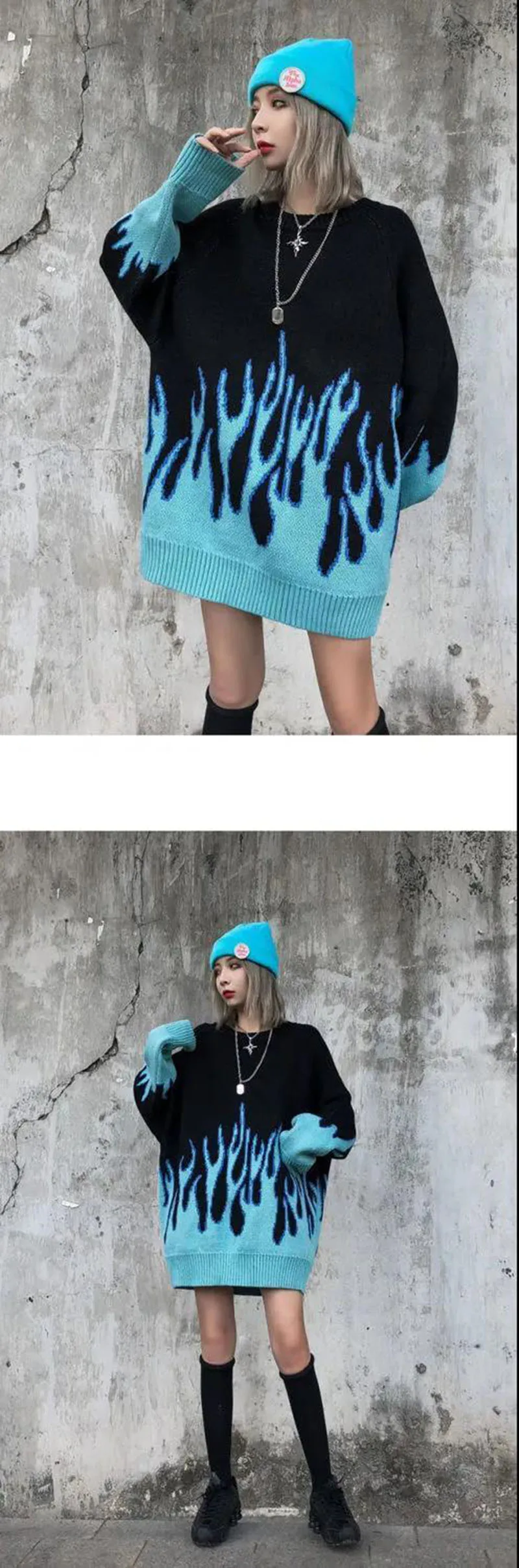 Женский свитер с круглым вырезом, Синий Свободный Длинный пуловер с синим пламенем, Осень-зима 2020