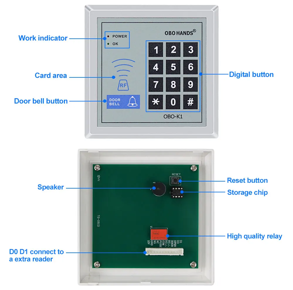 Поддержка пароля, RFID-карты, пароля + RFID-карты для открытия двери. Поддержка 1000 пользовательских карт, пароль 4 цифр, дата, copy функция поможет вам сэкономить время, чтобы программы.