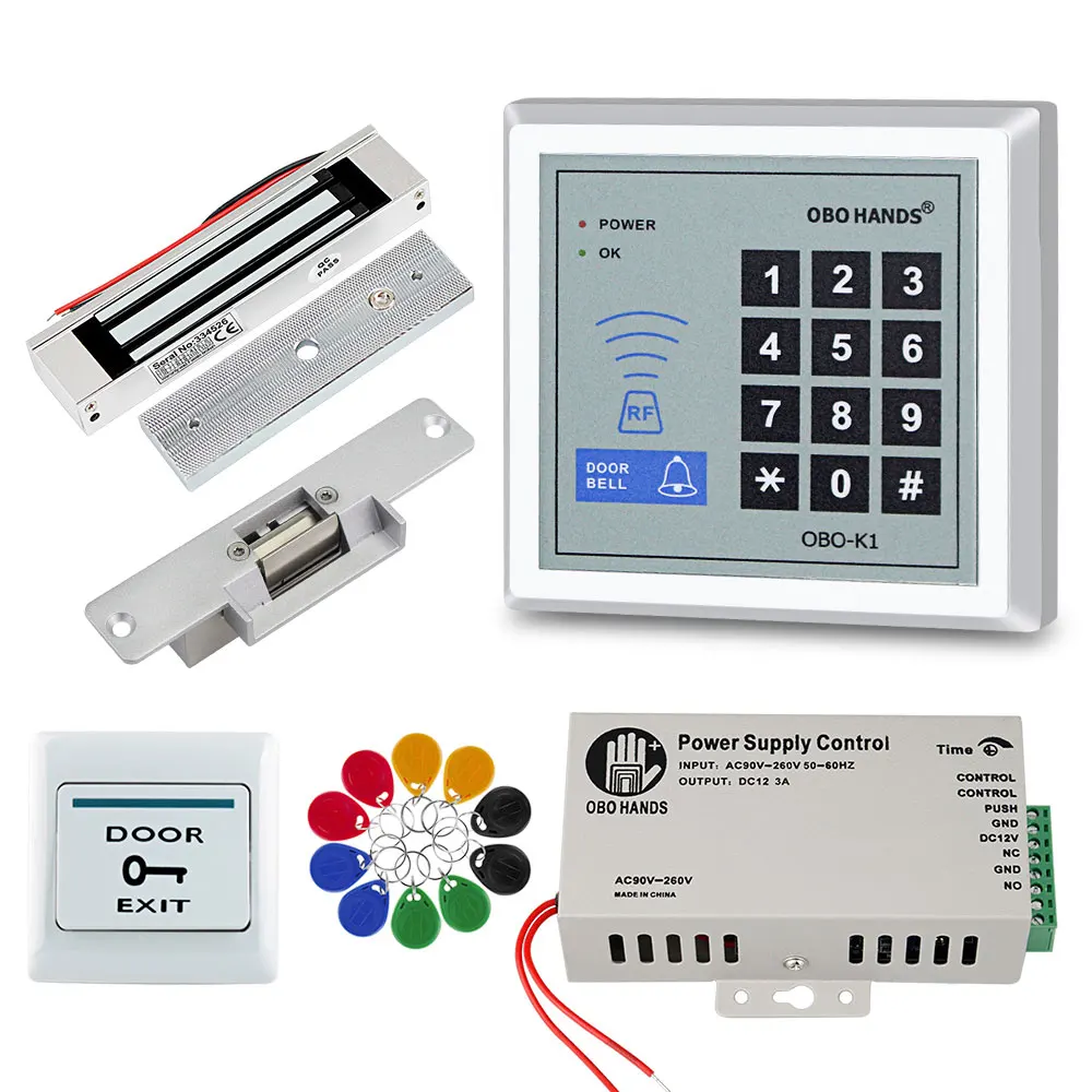 Это полноценная система контроля доступа, включающая клавиатуру управления доступом, источник питания DC12V, электрический замок, кнопку отключения двери и 10 брелоков RFID. О клавиатуре управления доступом, поверхность водонепроницаема. Когда на поверхности немного падает вода, это нормально для работы. (Чтобы использовать его долгое время, не кладите в воду и не пользуйтесь дождём.) Что касается электрического замка, существует несколько различных моделей на выбор: электрический затвор, электрический замок от падения, магнитный замок от 180 кг, встроенный замок 180 кг и Электрический болт. Вы можете выбрать разную модель в соответствии с вашей дверью.