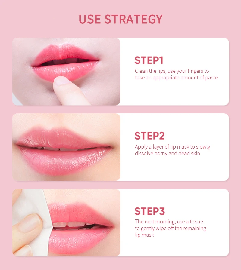 Витамин С-богатая ягода смешанный комплекс, содержащий аллантоин, пропиленгликоль, экстракт вишни, может устранить сухую, чешуйчатую омертвевшую кожу на губах ночью, тем самым делая губы гладкими на следующее утро.