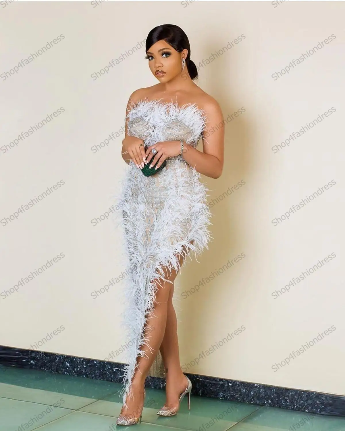 Белое платье-Русалка без бретелек с перьями для выпускного вечера, Сексуальные вечерние платья с Боковым Разрезом до щиколотки Aso Ebi, африканские вечерние платья, платье