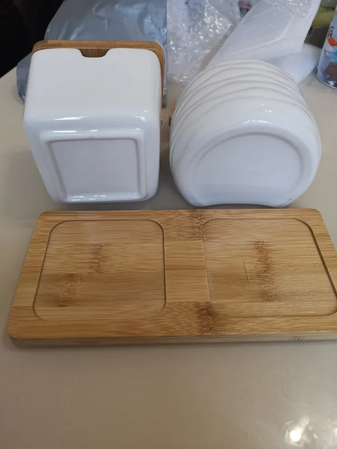 Очень плохова качество дерево и неправильная подставка ваняет чем-то поцарапоное. А ещё шурупы где крышка это что-то ♂️. Подставка должна быть с большой выемкой повсей поставке а она вырезано не правельно одна сахарница ездиет туда сюда. Полукруглая она не для этой подставке.