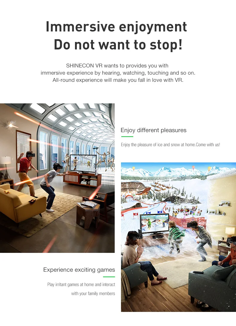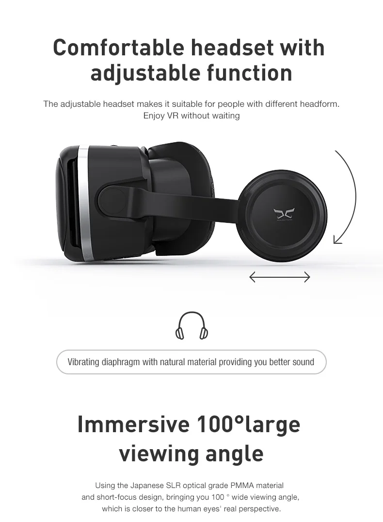 2. Поставляется с удобными регулируемыми наушниками, легко испытать захватывающий мир VR, качество окружающего звука 360 °