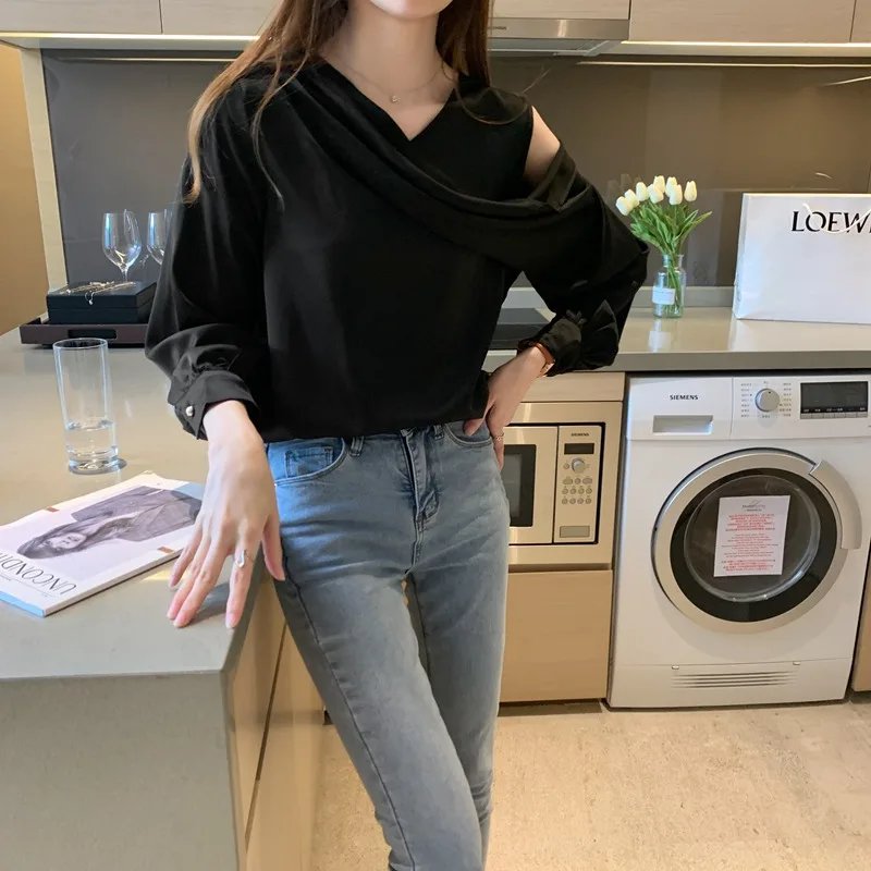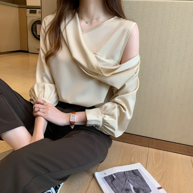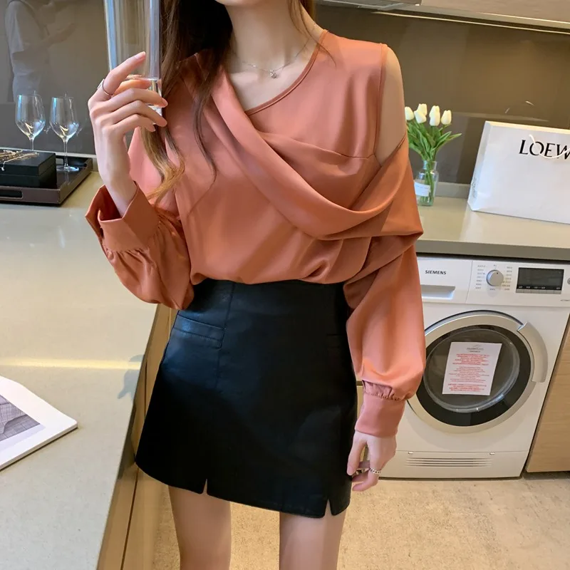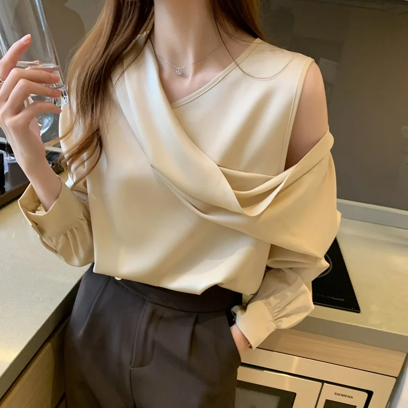 Топ женский атласный с V-образным вырезом, модная однотонная элегантная рубашка без бретелек, с длинным рукавом, весна-осень