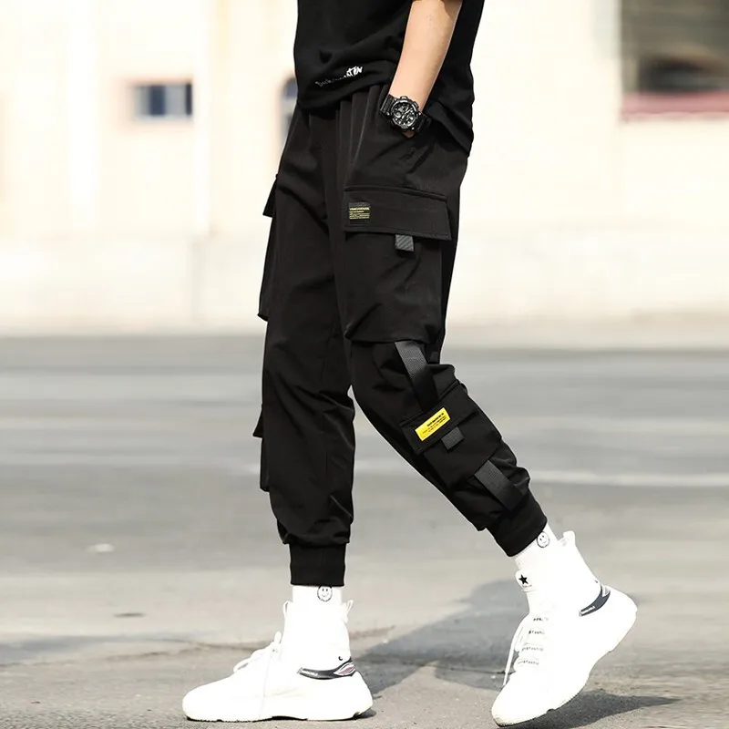 Брюки-карго мужские, в стиле хип-хоп, с черными лентами, с нескольк...