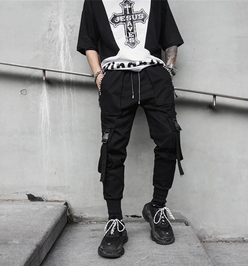 Брюки-карго мужские в стиле хип-хоп, модные штаны с лентами в стиле...