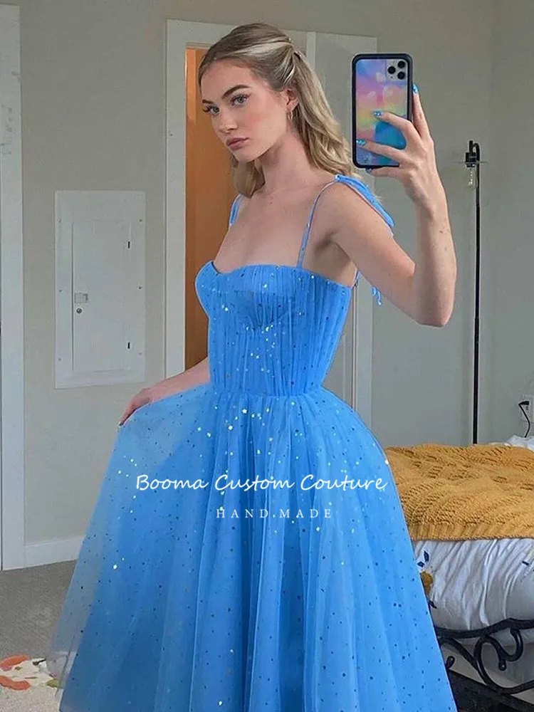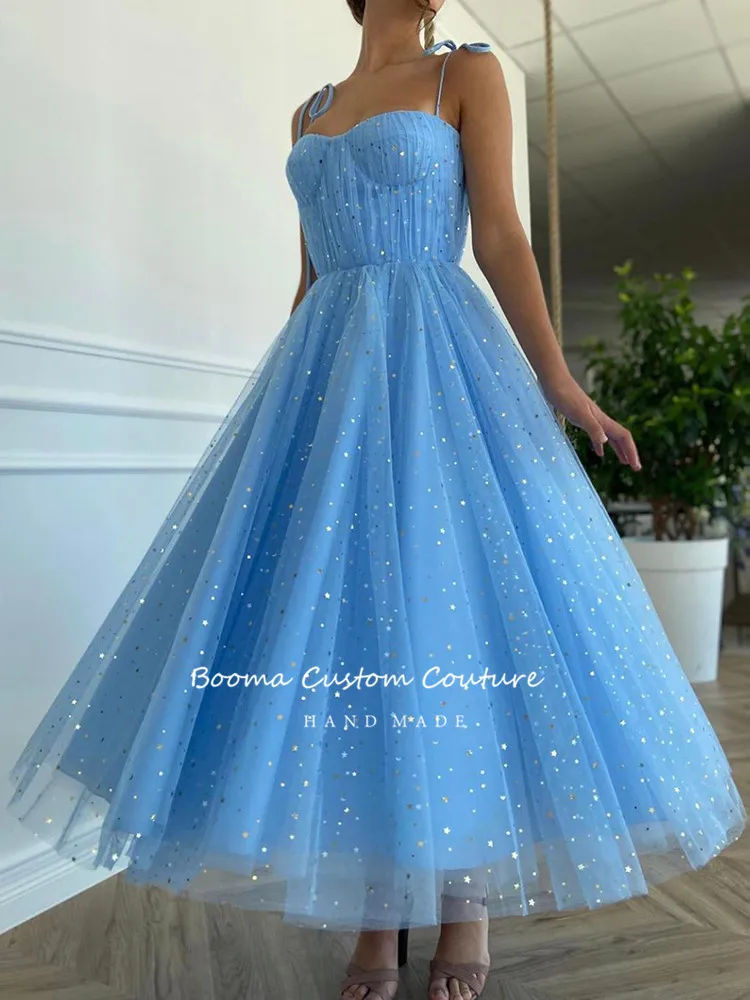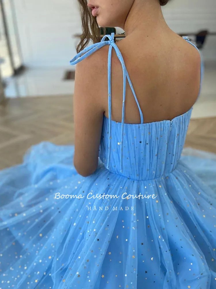 Платье для выпускного вечера, из тюля, со звездами, без бретелек, со складками, ТРАПЕЦИЕВИДНОЕ, синего цвета