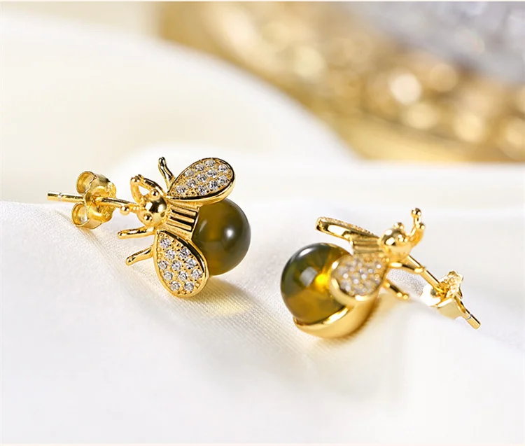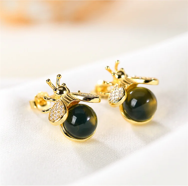 Серебряные серьги-гвоздики с милыми пчелами из голубого янтаря