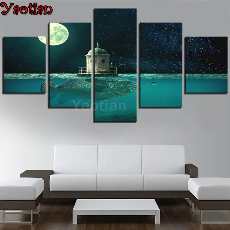 Алмазная живопись "сделай сам" Большая рыба 5D, вышивка крестиком, лунная ночь, морской пейзаж, алмазная вышивка, стразы, мозаика из страз 5 шт.компл.