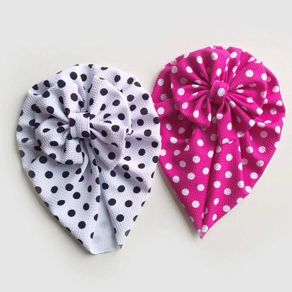 12 шт./лот, Новые шапки-тюрбаны в горошек с бантом для маленьких мальчиков и девочек, окрашенные шапочки-бини для малышей, шапки для новорожденных, детские шапки из вафельной ткани