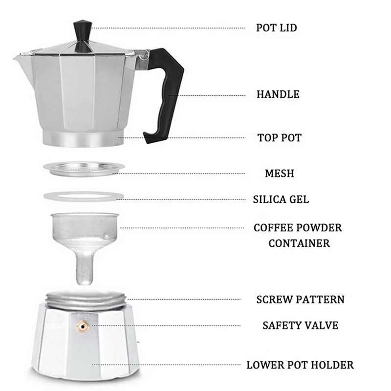 Простота использования:1. Добавьте воду.2. Наполните его молотым кофе.3. Прикрутите верхнюю часть кастрюли к основанию.4. Нагрейте.5. Когда верхушка кастрюли наполнится кофе, извлеките с плиты. Вы можете начать наслаждаться кофе.