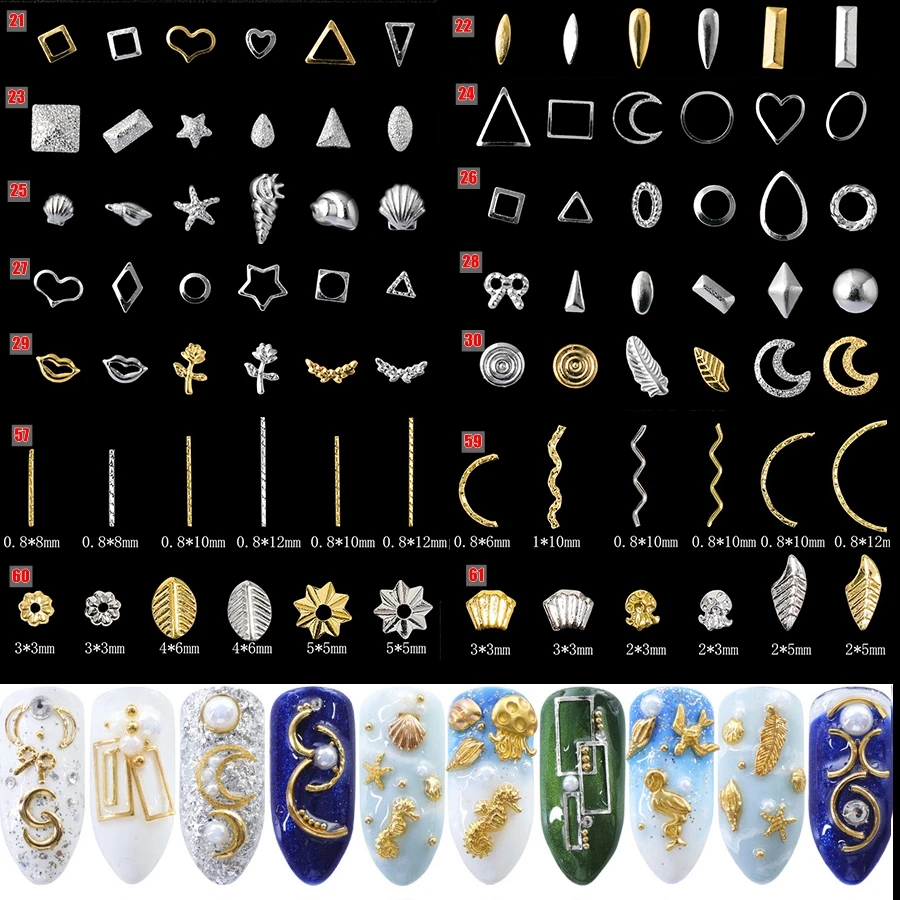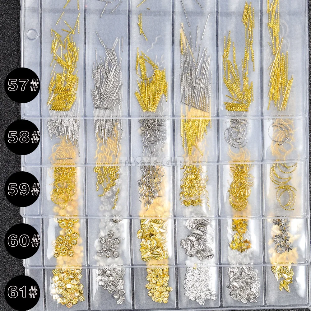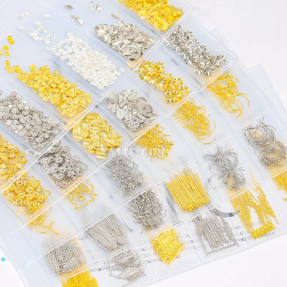 6 ячеек в упаковке, 3D золотые и серебряные металлические Смешанные скрученные изогнутые полоски, листья, различные сплав для дизайна ногтей украшения, маникюрные шармы, драгоценные камни