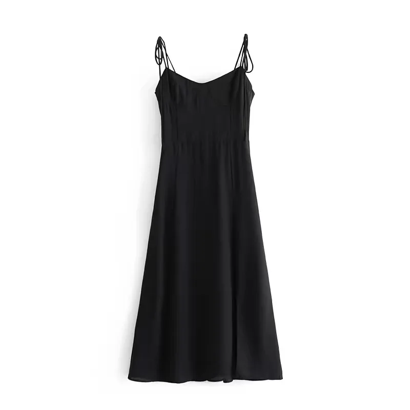 Платье женское на тонких бретелях, однотонное черное платье на завязках, с разрезом, во французском стиле, вечерние
