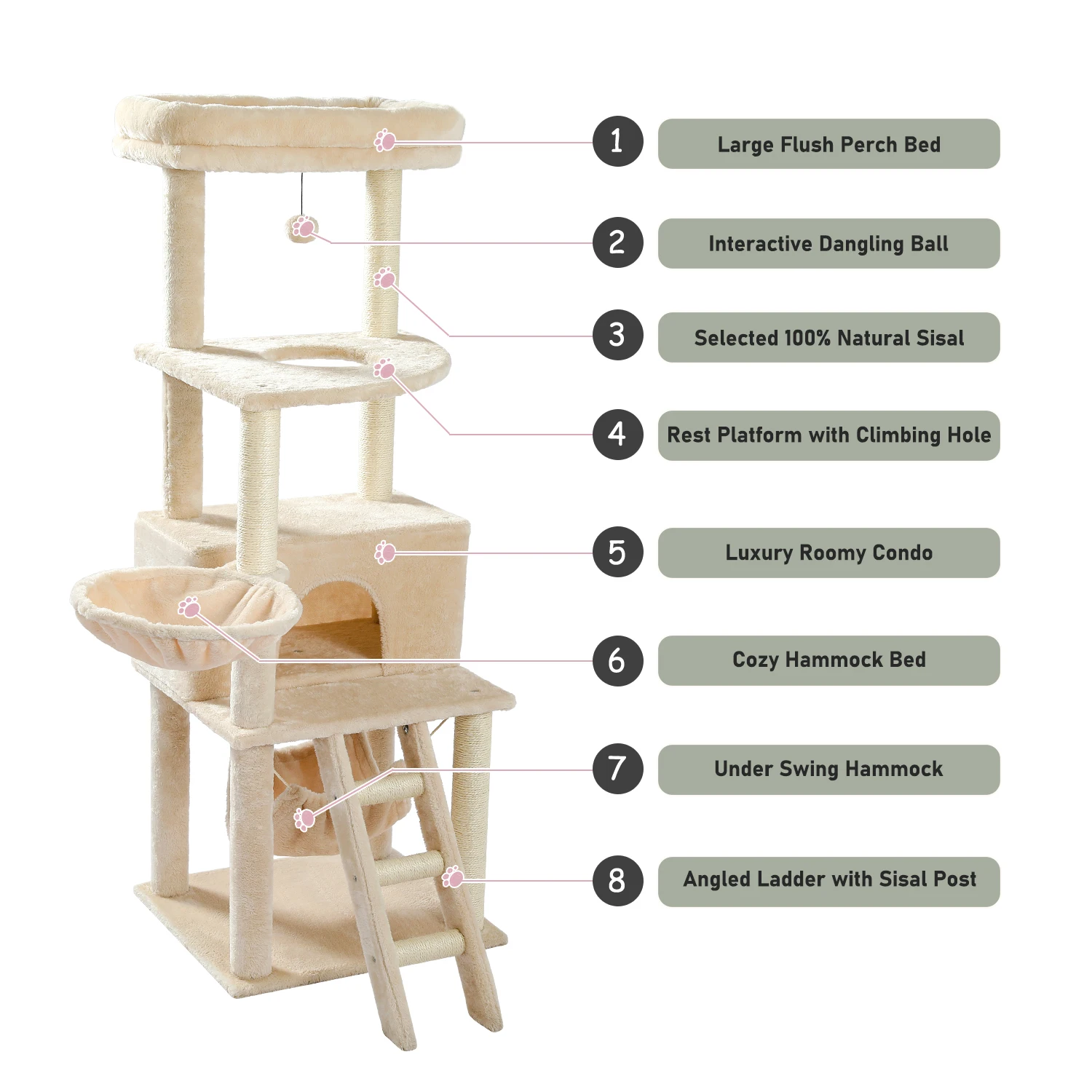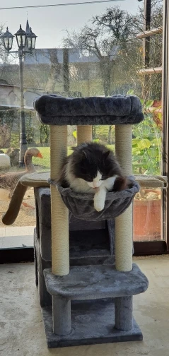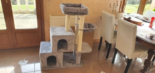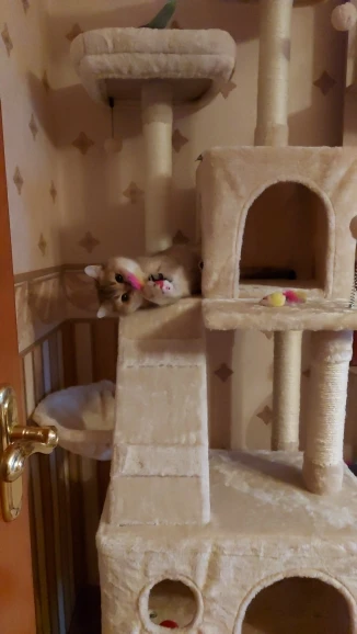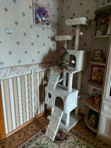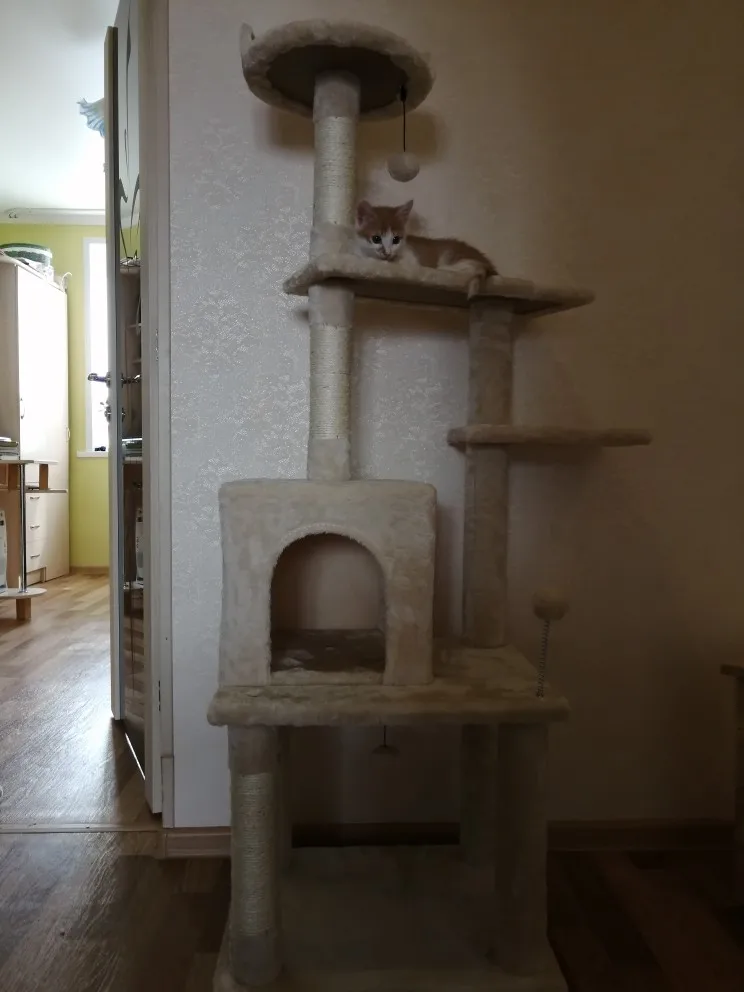 Отличный комплекс! Заказали поздно вечером 31го марта, 5 апреля до обеда уже доставили, доставка из России, занесли прямо домой. Собирали часа 2 с непривычки, но проблем нет, инструкция подробная и пошаговая. Собирается всё на шурупы. Слегка есть запах как в мебельном магазине, но не противный. Цвет приятный, светло-бежевый. Конструкция не особо устойчивая, пошатывается, когда кошка носится, но есть крепление комплекса к стене. Лежанки довольно твёрдые, но кошка заценила, валяется. Лестницы особо и не нужны, скачет как попало, залазит по когтеточкам наверх)) Есть запасной шарик в комплекте. Очень понравился товар, рекомендую!