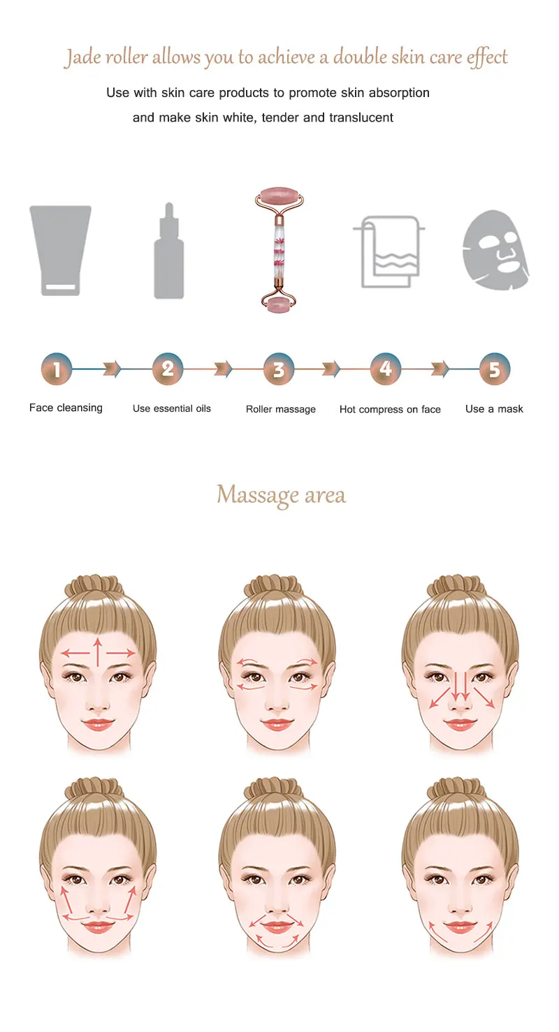 1. Снимает напряжение лица 2. Улучшает эластичность кожи и тонизирует кожу 3. Препятствует появлению тонких линий и морщин 4. Уменьшает отечность, мешки для глаз и темные круги вокруг глаз 5. Помогает проникнуть в косметику, как кремы для лица и сыворотки глубже в кожу для лучшего поглощения 6. Способствует циркуляции крови к лицу для естественного здорового свечения