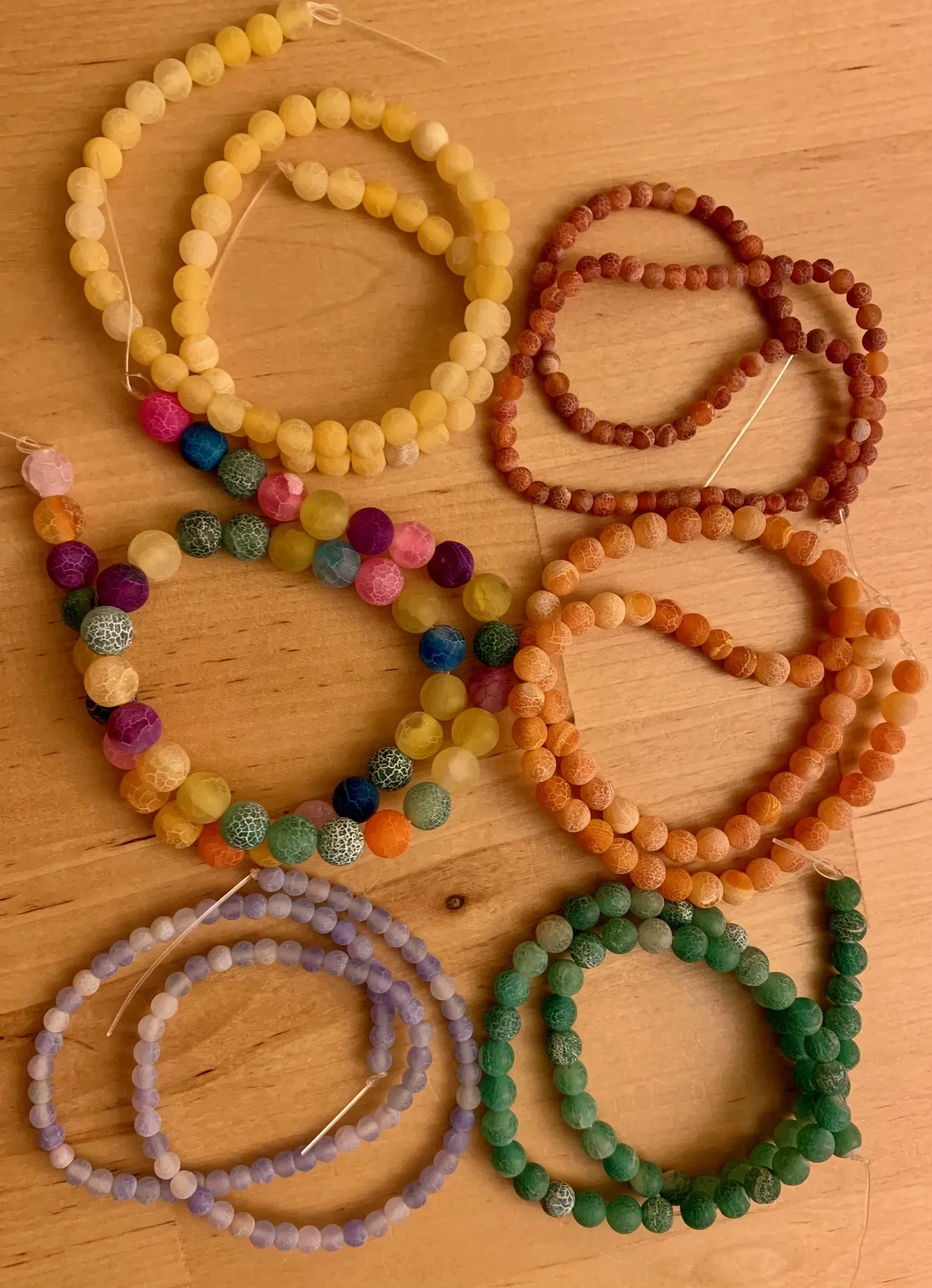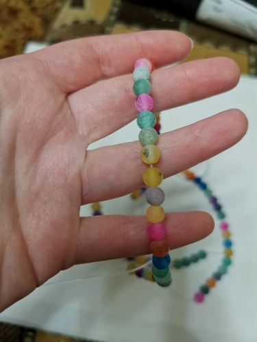 Заказывала бусины размером 6мм. Пришли 63 штуки, из них примерно 5 более мелкого размера. Ещё комментарий для таких же разинь как я: обратите внимание, насколько это мелкие бусы, сколько их помещается на взрослую руку. Комплект из 60 - это полтора взрослых браслета.