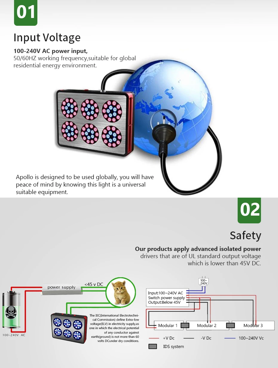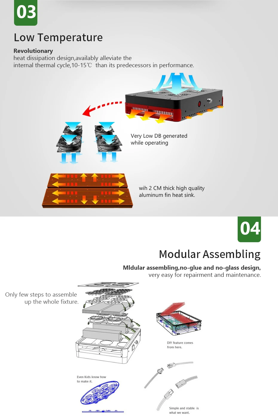 Революционный дизайн рассеивания тепла, позволяет облегчить внутренний тепловой цикл, на 10/15 по Цельсию ниже, чем его прекурсор в производительности. Интеллектуальная система контроля, обеспечивает все оборудование в хорошем рабочем состоянии. Используя Расширенный изолированный драйвер питания, UL стандартное выходное напряжение, которое ниже 45 В постоянного тока. Мягкая пусковая защита, чтобы избежать воздействия переходных токов, эффективно защищает светодиоды от повреждений высокого напряжения. Алюминиевый лицевой щит, корпус доступен для различных цветов: красный, белый, черный. Легче и удобнее для доставки, модульная сборка очень удобное обслуживание. Модульная сборка, без клея и стеклянного дизайна, очень легко для ремонта и обслуживания. Новая технология в вентиляторах будет более долговечной, уменьшая 50% шума. Благодаря оптическим объективам, проникание более выдающееся, может быть в 10-15 раз мощнее, доступно четыре варианта линз-90 градусов, 120 градусов.