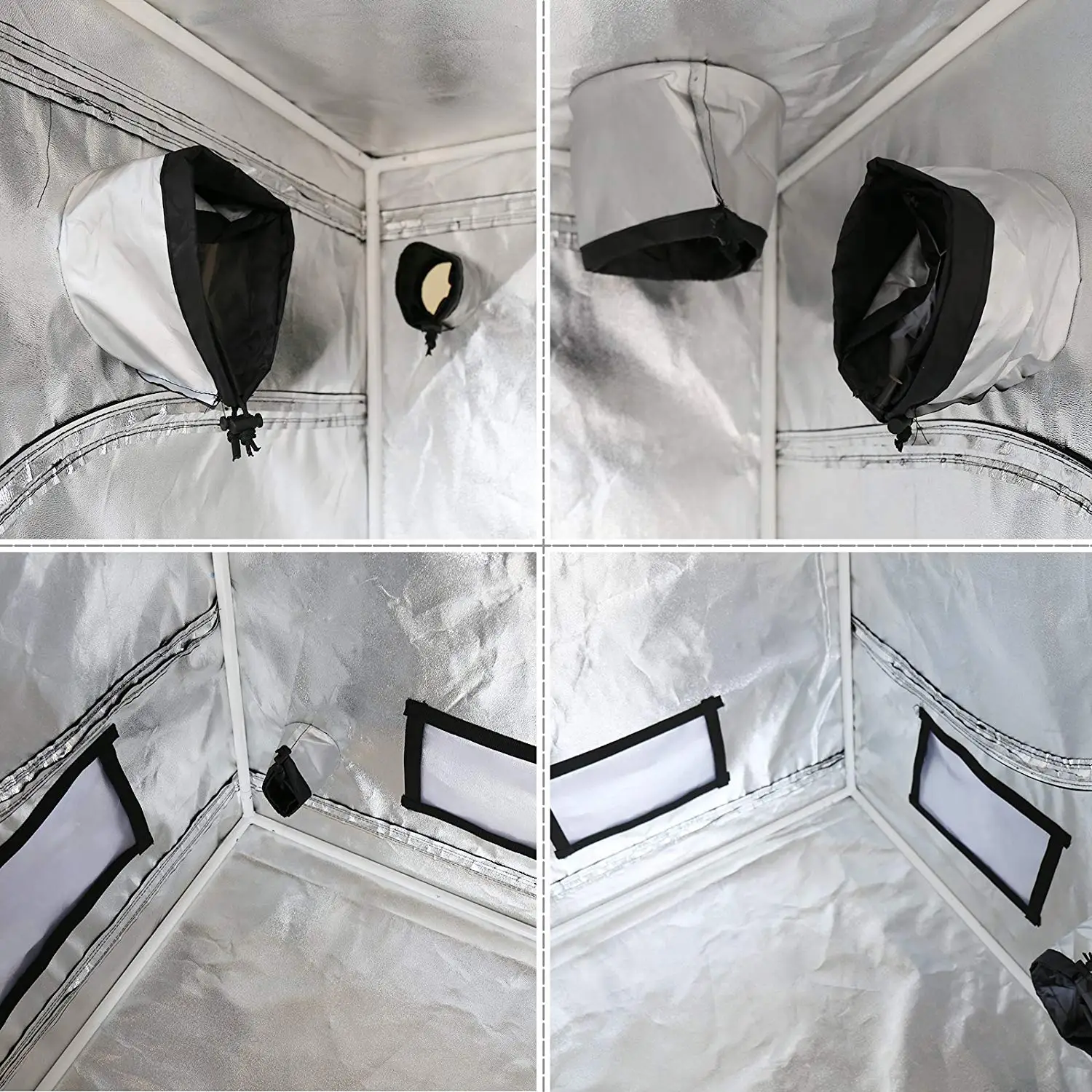95% светоотражающий серебряный Майларовый интерьер Этот светильник ограничен для стен Несколько строковых портов Легко закрепить любой воздуховод-Просто затяните порты Прочный Холст Он не рвет или не рвет Жесткие опорные стержни Легко повесить свет и систему извлечения. Жесткая рама и углы Они будут держать тяжелое оборудование без изгиба.