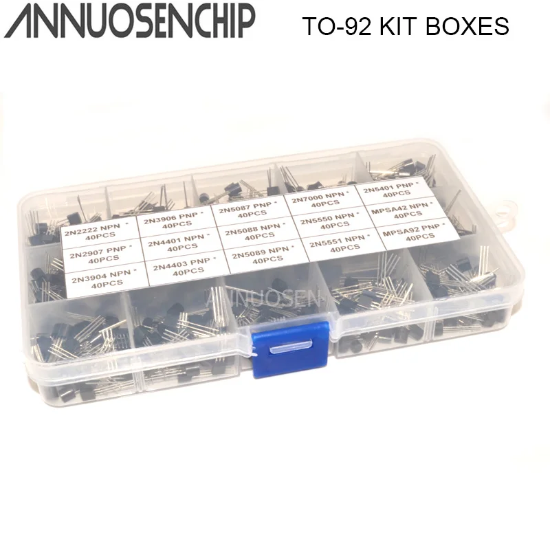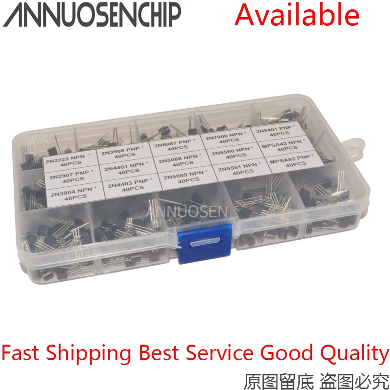 15 значений x40 600 шт. ассортимент транзисторов TO-92, 2N2222 2N3904 2N3906 2N5088 2N5089 2N7000 MPSA42 MPSA92 и т. д.