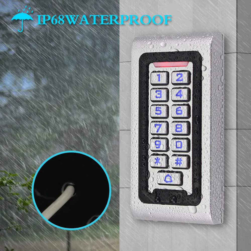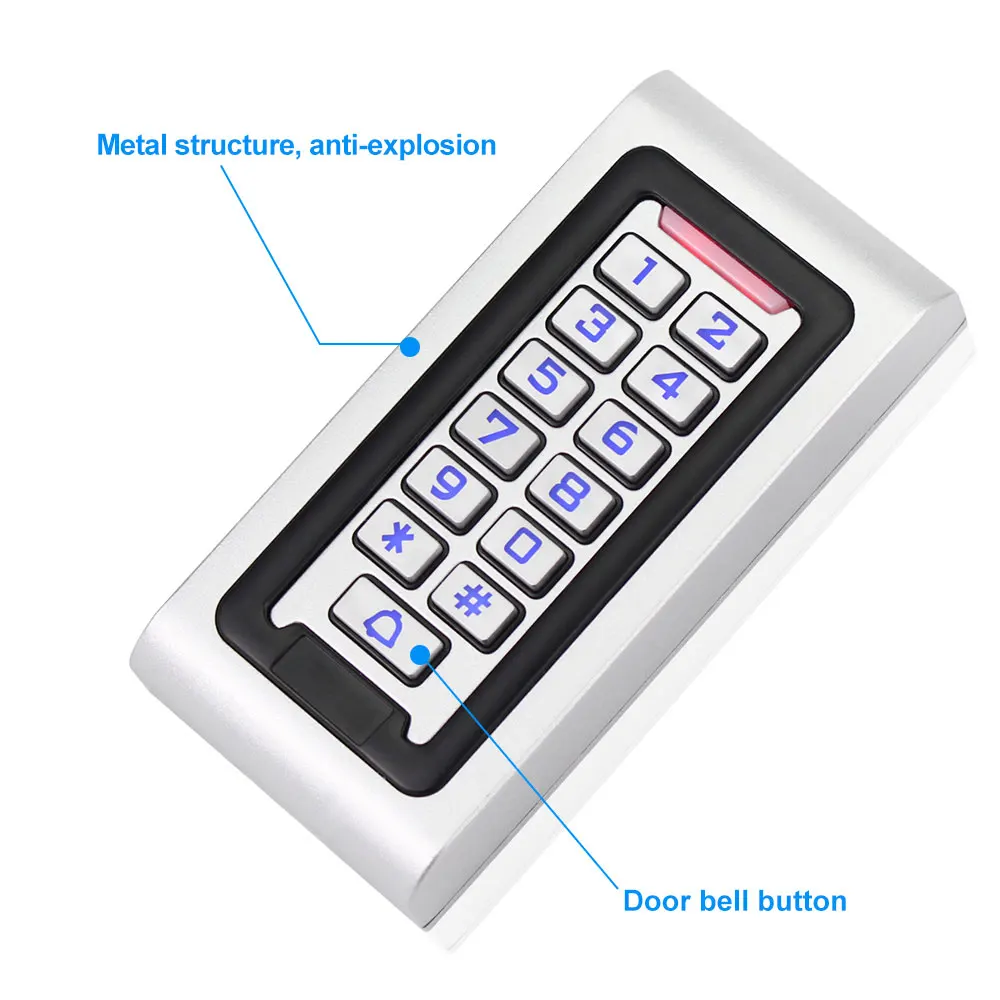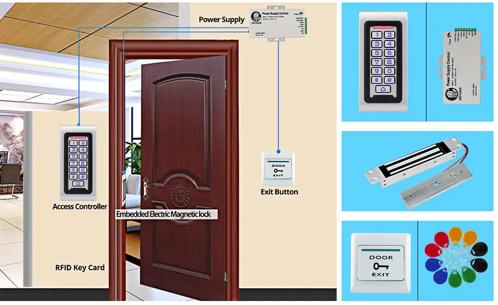 Это полная система контроля доступа, включая клавиатуру управления доступом, источник питания 12 В постоянного тока, электрический замок, кнопку разблокировки двери и 10 брелоков RFID. О клавиатуре управления доступом, водонепроницаемость IP68. Можно устанавливать на открытом воздухе. Что касается электрического замка, то есть несколько различных моделей на выбор: электрический замок, электрический замок падения, 180 кг разворачивающийся магнитный замок, 180 кг встроенный замок и электрический замок болта. Вы можете выбрать другую модель в соответствии с вашей дверью.