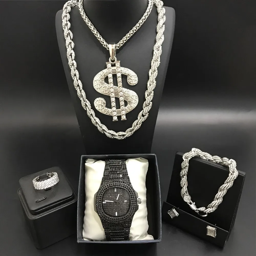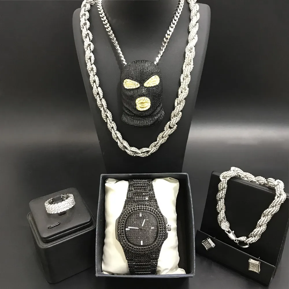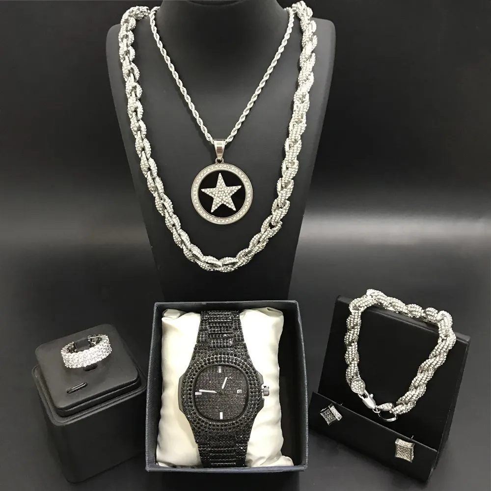 Роскошные мужские часы черного цвета с ожерельем, браслетом, кольцом и серьгами, комбинированные часы в Кубинском стиле с кристаллами в стиле хип-хоп для мужчин