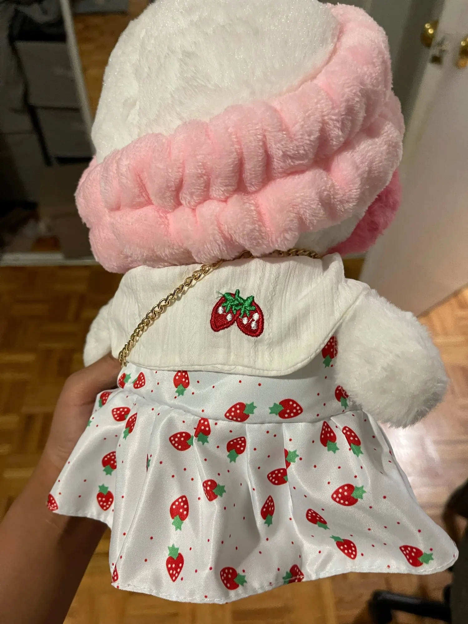 So cute!! Exactly like pics, really high quality too. Shipped in time and came in cute packaging also. The chain on the bag doesn’t feel cheap and also has clasps to take it on / off. Idk if the strawberries are supposed to be worn in front bc there’s a collar, but I love it like this. Super happy and recommend!! Will buy again!