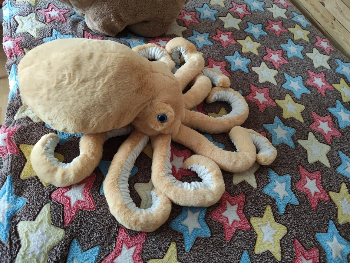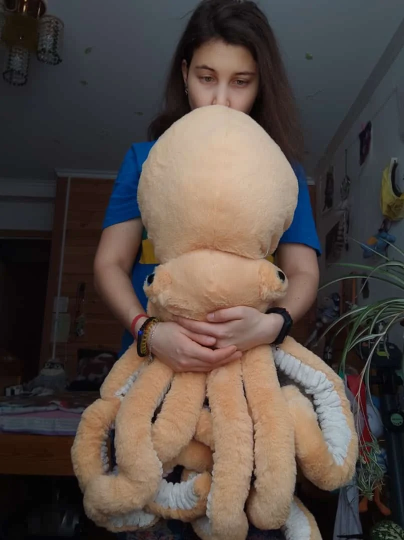 Этот осьминог просто чудо!!! Советую!!! Все как в описании. Очень мягкий, приятный на ощупь, качественно прошит. От него будут в восторге и маленькие и взрослые! Посылка шла 2 недели- это очень быстро, на неделю раньше предполагаемого срока. Что естественно большой плюс!!! Посылка (осьминог 90 см.) габаритная, но весит всего 0,99кг (обернута в прочный непрозрачный полиэтилен).