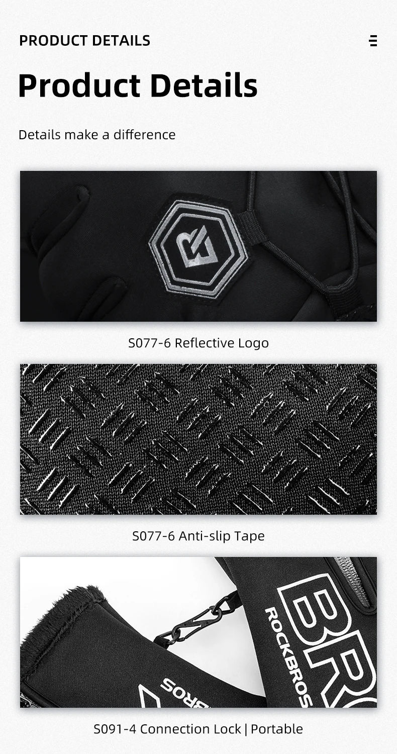 Бренд: ROCKBROSМатериал: бархатМодель: S091-4 и S077-6Вес:S091-4: около 70 г/параS077-6: около 48 г/параСенсорный экран:S091-4: большой палец, указательный палец, средний палецS077-6: большой палец, указательный палецВодонепроницаемый: водоотталкивающийХарактеристики: Добавьте бархат, чтобы сохранить тепло, чувствительный сенсорный экран, водоотталкивающий