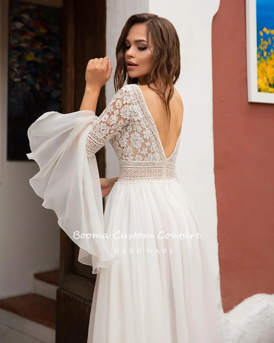 Сексуальное богемное Пляжные Свадебные платья сексуальное нижнее белье с глубоким v-образным вырезом Высокий разрез Свадебные платья без спинки кружевной топ с длинными расклешенными рукавами Свадебные платья из шифона