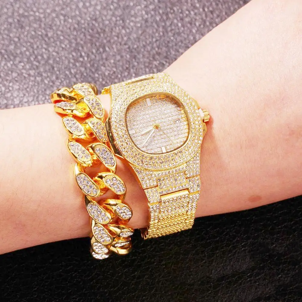 Комплект ювелирных изделий из кубинской цепи Майами для мужчин и женщин, комплект из ожерелья, часов и браслета в стиле хип-хоп, стразы золотистого цвета со сверкающим покрытием, 32 шт.