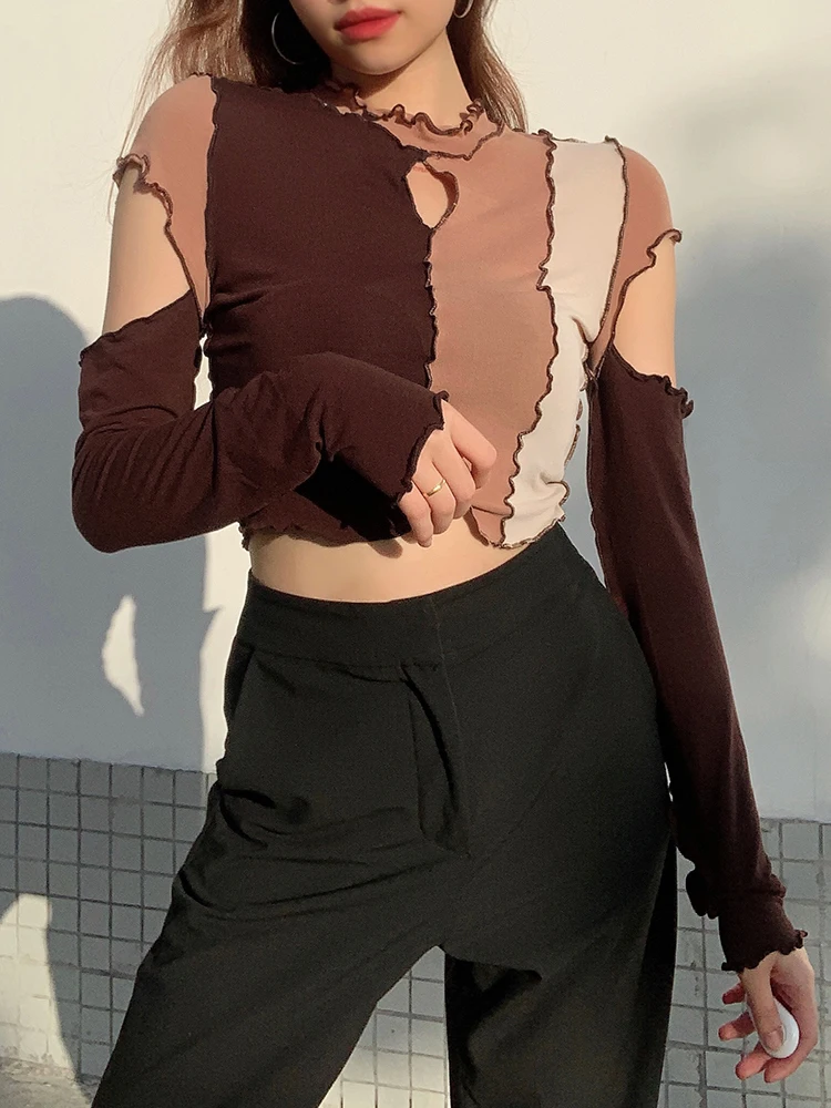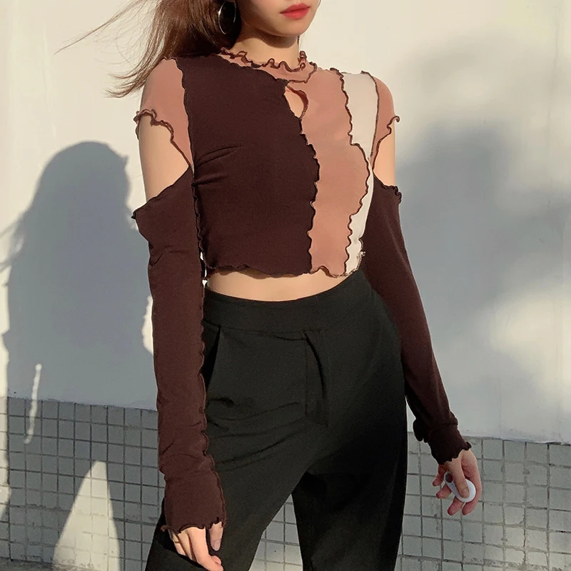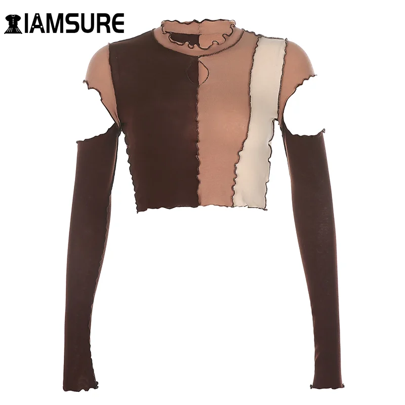 IAMSURE в стиле пэчворк повседневные женские футболки вырезать тонкий сексуальный укороченный Топ с длинным рукавом топ, футболка 2020 осень в стиле панк для девочек 90s в уличном стиле
