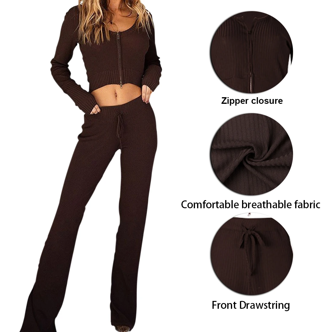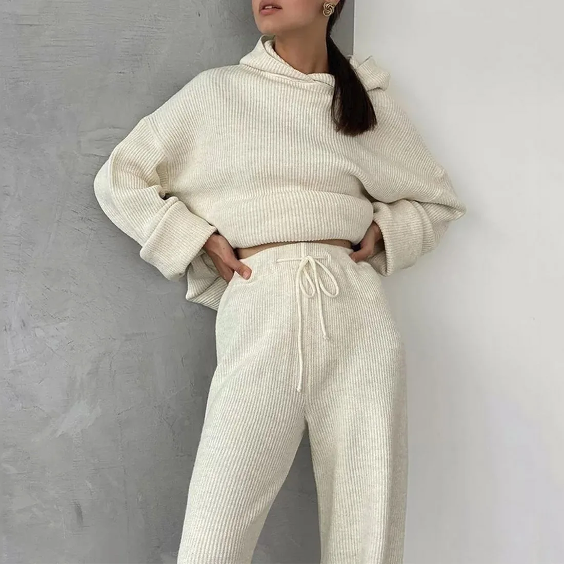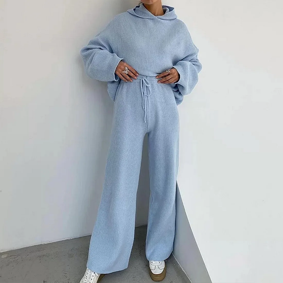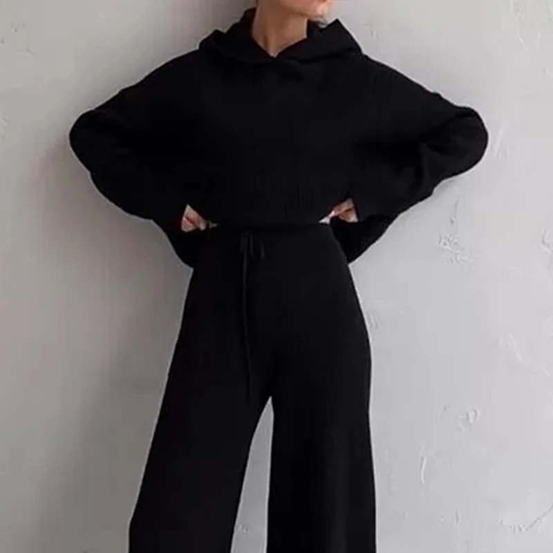 Female Lounge WearWide Leg Pants and Hoodies Knitting Sets