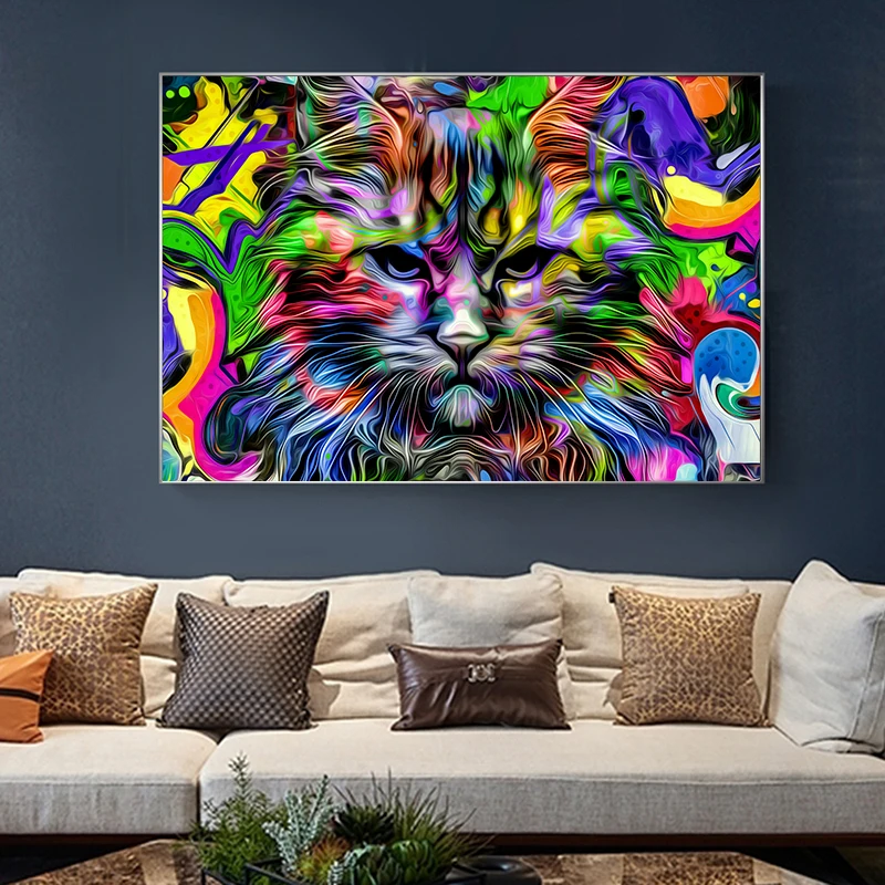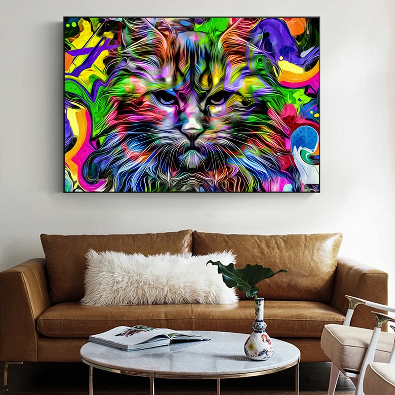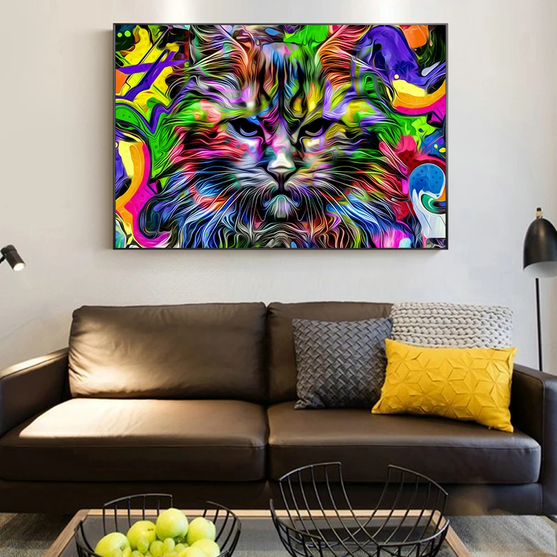 Абстрактная психоделическая кошка, холст, живопись, постеры и принты, красочные животные, настенные картины для декора гостиной