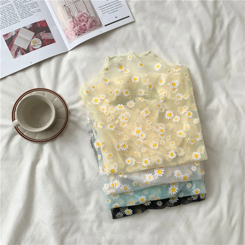Блузка женская сетчатая, Повседневная Просвечивающая рубашка с принтом ромашек и цветов, топы для девочек, лето-осень