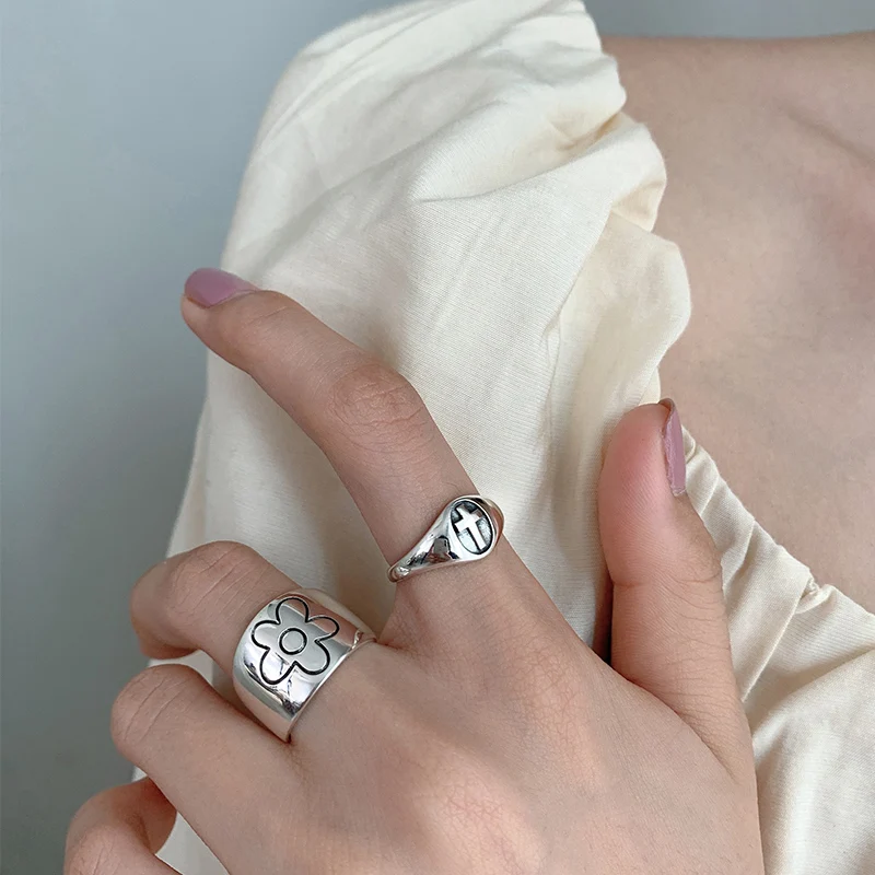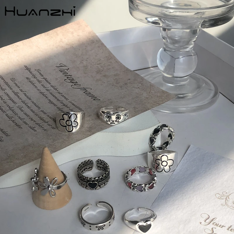 Кольцо женское металлическое HUANZHI, серебристого цвета, с глазурованным черным сердцем и цветком маргаритки, в Корейском стиле, 2020
