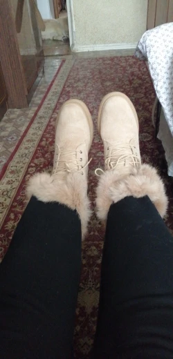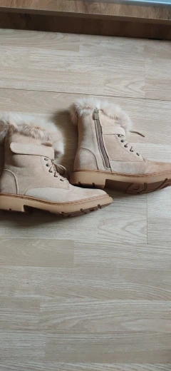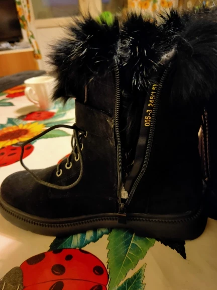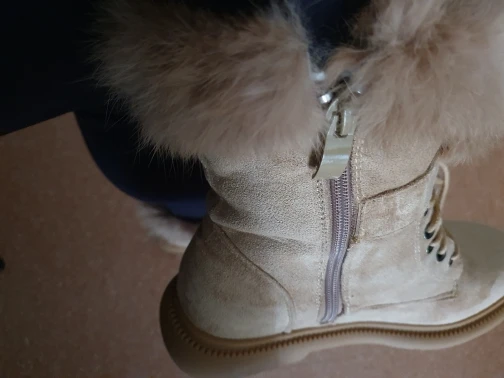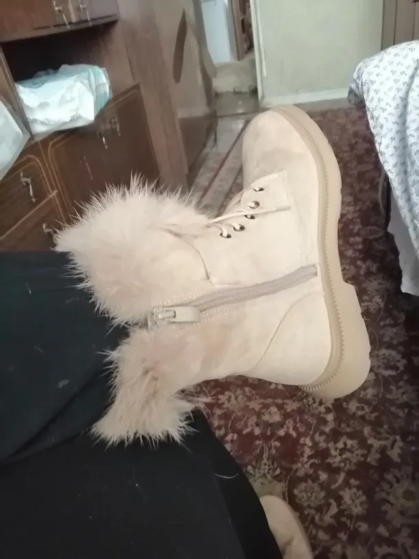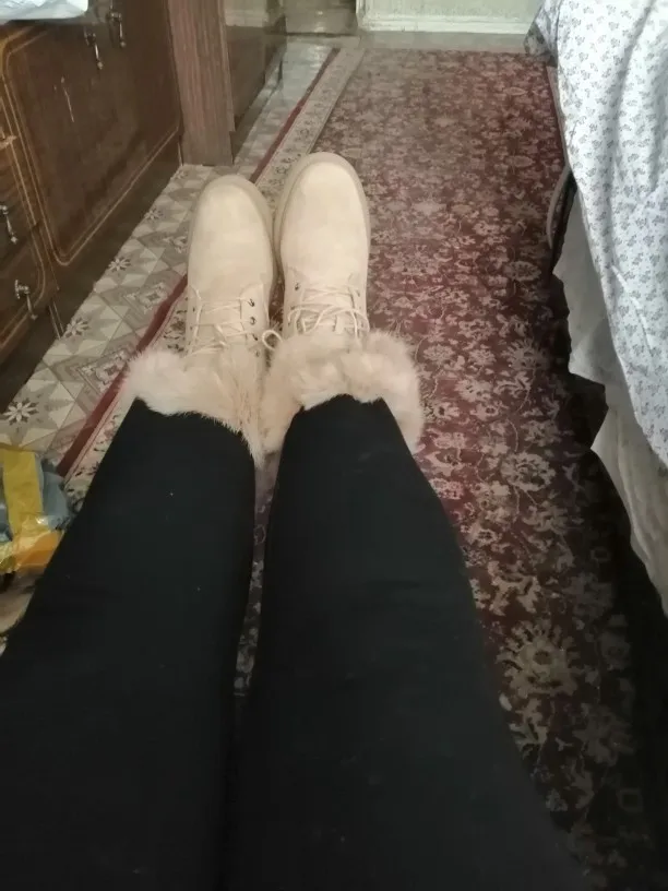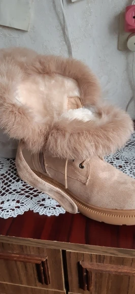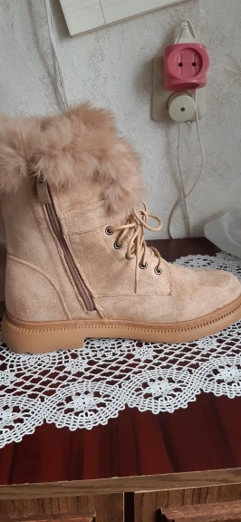 Ботинки пришли за месяц в Архангельскую область, вместе с другими заказами на почту. Заказывала светлые, но потом подумала и написала продавцу что хочу поменять цвет на чёрный, светлые очень марки, а это не кожа а замша, очень не красиво будет после смотреться. Продавец согласился и отправил мне то что я просила. За это ему звезду⭐. Ботинки хорошие, мягкие, как и на сайте продавца, но мех тонкий, и думаю, на - 20 в них ноги отмерзнут, на тёплую зиму ещё пойдёт, но не на севере, с крепкими морозами в них ходить, стельки в них приклеены, так что сразу надо стельку другую вкладывать. Подошва резиновая, как будет на улице не знаю пока. Позже отпишусь.