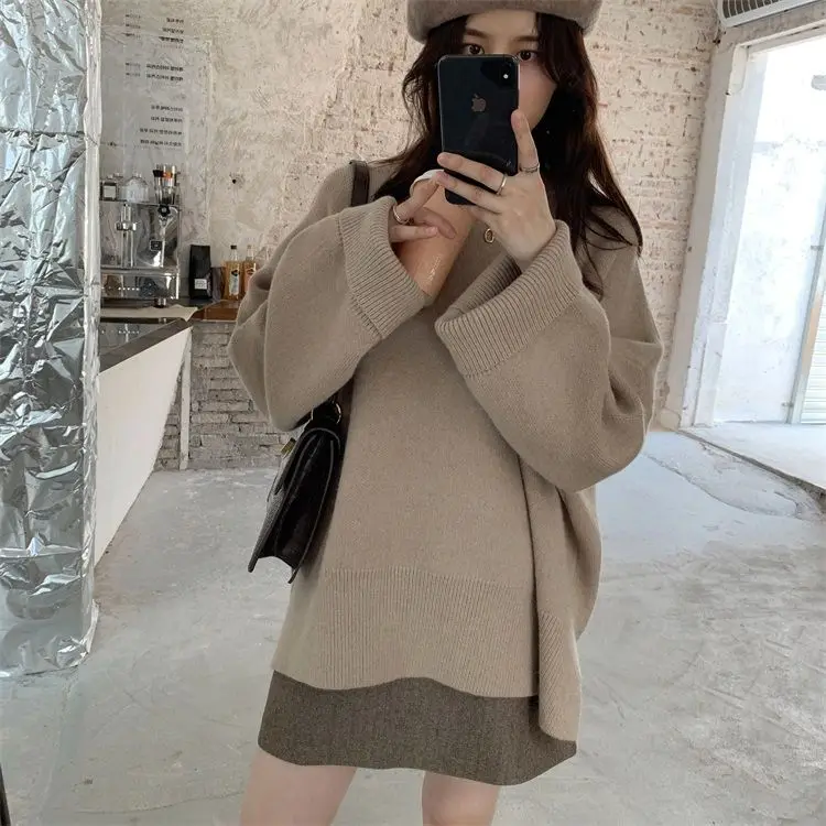 Осенне-зимний новый однотонный свободный свитер с разрезом женский студенческий Универсальный свитер средней длины с длинным рукавом