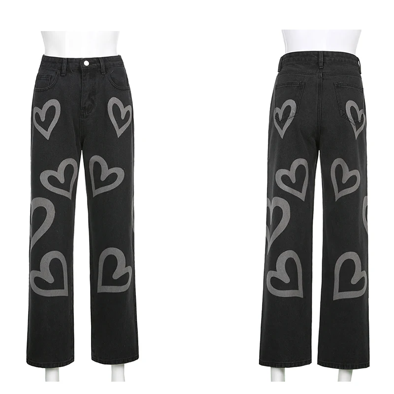 Джинсы женские прямые с принтом сердца, мешковатые, с высокой талией, в стиле Харадзюку, в Корейском стиле, в стиле 90-х, уличные