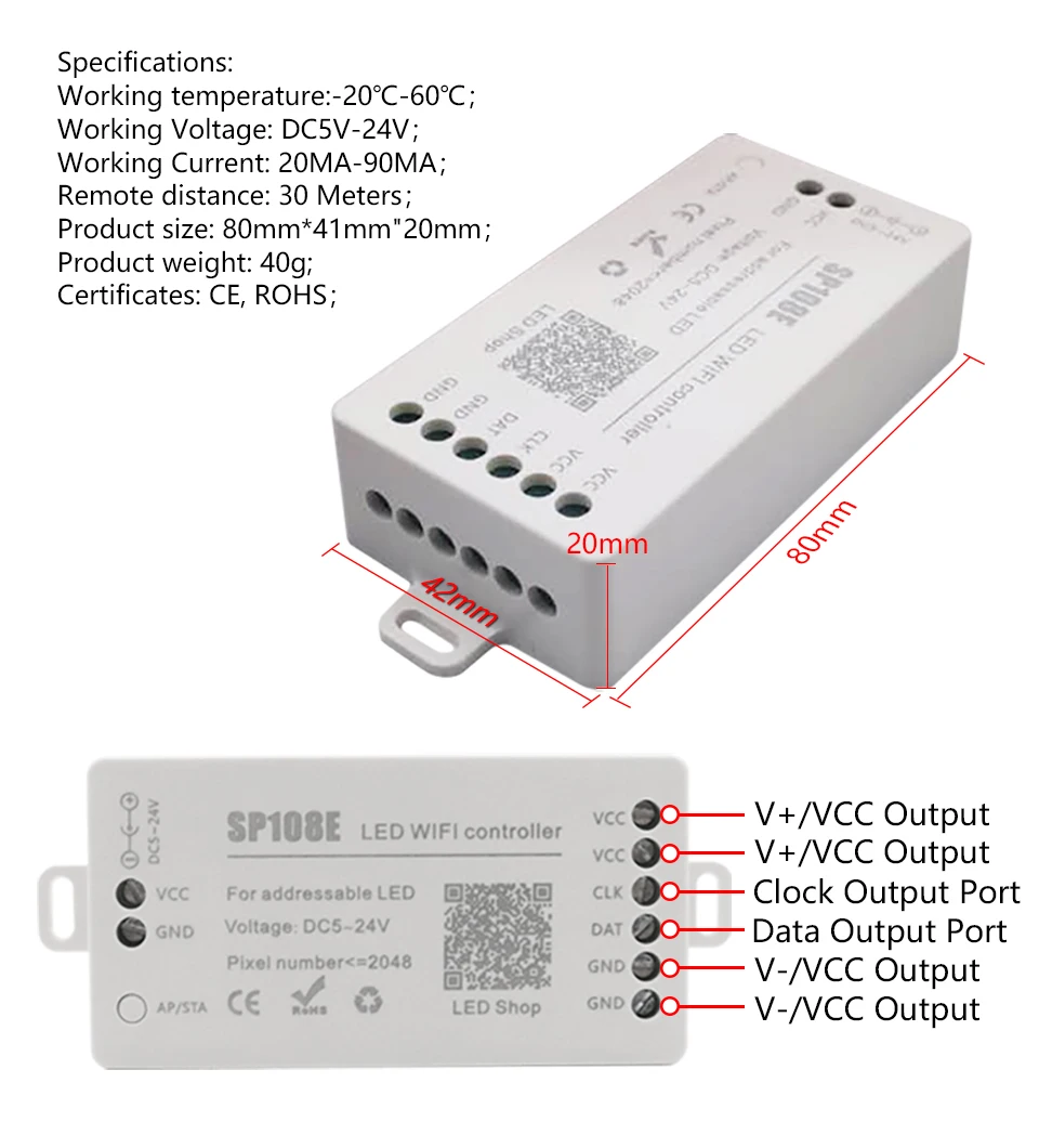 Характеристики:1) Дистанционное управление с помощью Wi-Fi;2) Поддержка режима маршрутизации (AP) и режима подключения к локальной сети (STA);3) Поддержка почти всех видов однопроводного или двухпроводного светодиодный IC драйвера;4) Регулировка яркости, 180 видов узоров и 8 видов цветовых регулируемых узоров;5) любой эффект с использованием метода эффекта творчества-изображения для пользователя;6) поддерживает настройку номера пикселя и номера детали, которые могут управлять до 2048 пикселей;7) Предотвращает обратного подключения DC5V ~ 24V widerangeworking напряжение источника питания;8) Сохранение настроек пользователя;Управление приложением:Доступны как версия IOS, так и Версия ОС Android. (аппаратное обеспечение должно поддерживать wifi)• Требуется IOS версии 10,0 или выше;• Требуется Android OS версии 4,4 или выше;• Найдите «LedShop» или Google pay в app store или отсканируйте этот qr-код, чтобы загрузить и установить приложениеХарактеристики:Рабочая температура: -20 ~ 60 градусов по ЦельсиюРабочее напряжение: 5 в пост. Тока ~ 24 В;Рабочий ток: 20 мА ~ 130 мА;Удаленное расстояние: 30 метров;Размер изделия: 85 мм * 45 мм * 22 мм;Вес изделия: 40 г;Сертификаты: CE, RoHS;Светодиоды управления: 2048 пикселейРежим работы и подключения:AP (точка доступа) режим: контроллер и телефон подключены напрямую, контроллер работает как точка доступа.Шаги подключения:1) Когда устройство не подключено к любой сети Wi-Fi, включите контроллер и подождите 20 с, а затем контроллер изменит режим intoAP;2) на странице настройки Wi-Fi найдите контроллер и подключите его (имя likeSP108E_xxx, код по умолчанию 12345678),3) откройте приложение «светодиодный магазин», затем контроллер отобразится в списке устройств;* Режим STA (станция): контроллер и телефон находятся в той же сети WIFI, в этой сети пользователи могут управлять контроллером плавно.Шаги подключения:1) Когда устройство не подключено к какой-либо сети Wi-Fi, питание на контроллере, контроллер останется в режиме inWait-For-Connet в течение 20 секунд;2) Убедитесь, что ваш телефон подключен к сети Wi-Fi, откройте приложение «светодиодный магазин», нажмите кнопку «устройство», Введите ПИН-код WIFI, затем нажмите theokto, чтобы подтвердить и дождаться завершения процесса настройки;3) Когда контроллер успешно входит в сеть WIFI, он отображается в списке устройств;4) Пользователь может выбрать контроллер и отсоединить его от сети, нажав на кнопку устройства, затем контроллер переключится в режим AP.